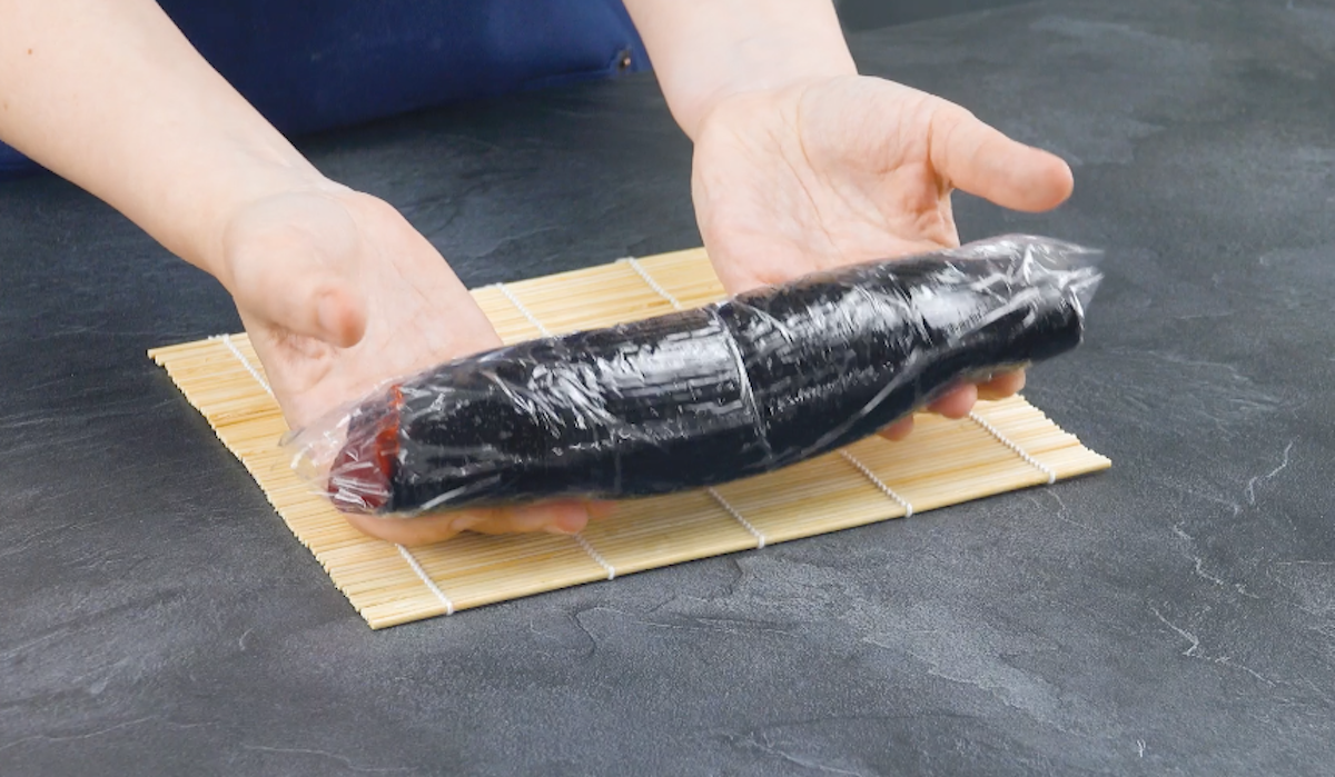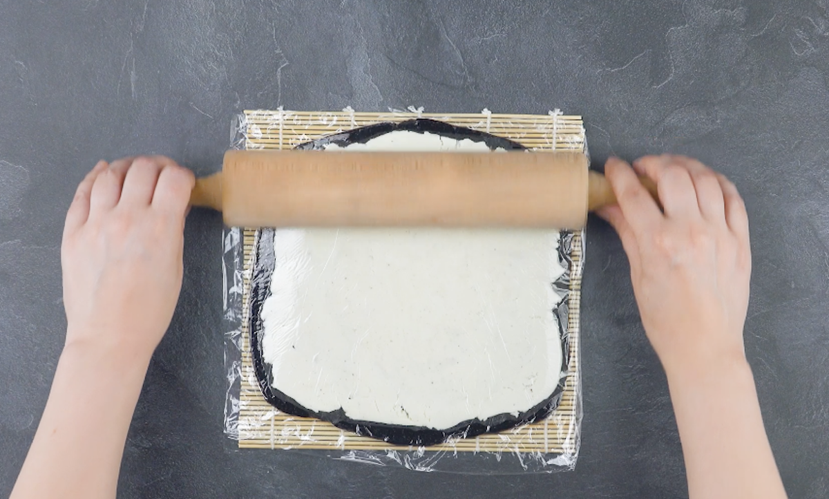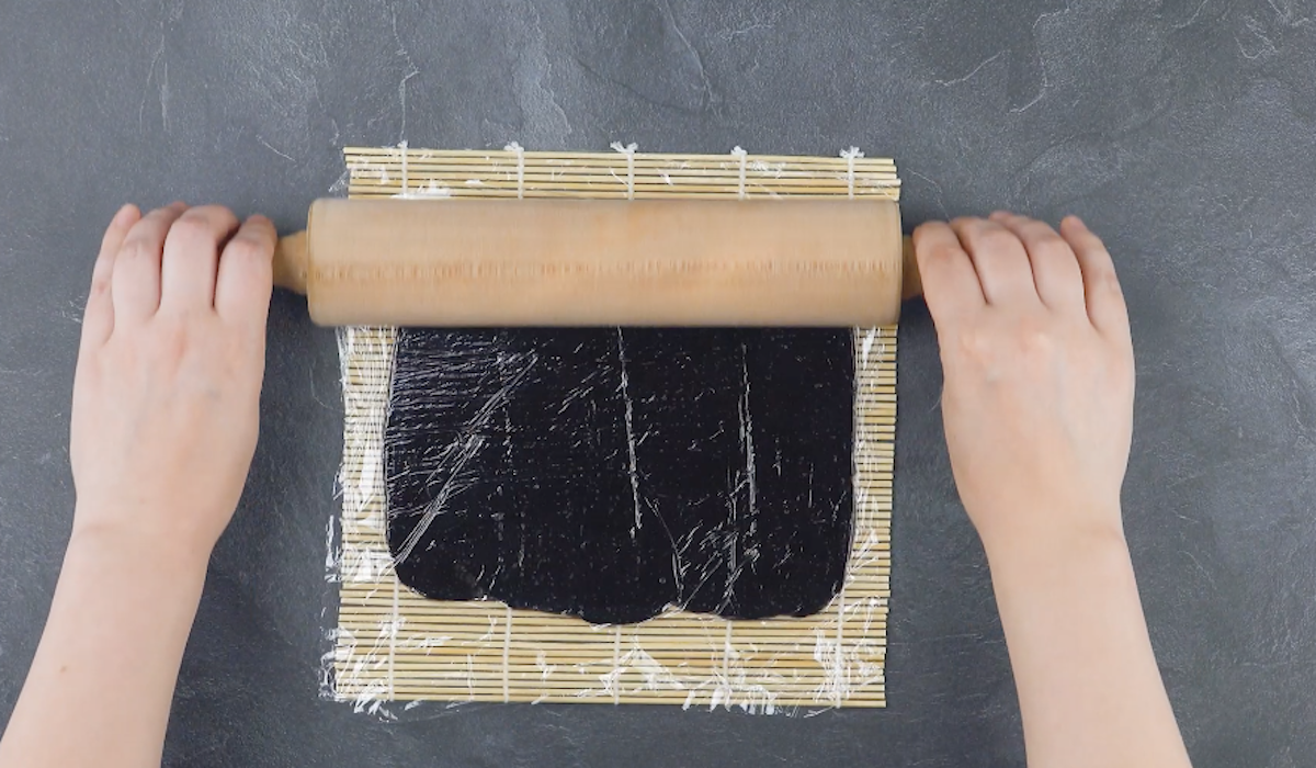 2. Lege ein Stück Frischhaltefolie auf die Sushimatte und gib die schwarze Oreo-Keksmasse darauf. Lege ein weiteres Stück Frischhaltefolie darauf und rolle die Masse mit einem Nudelholz aus.