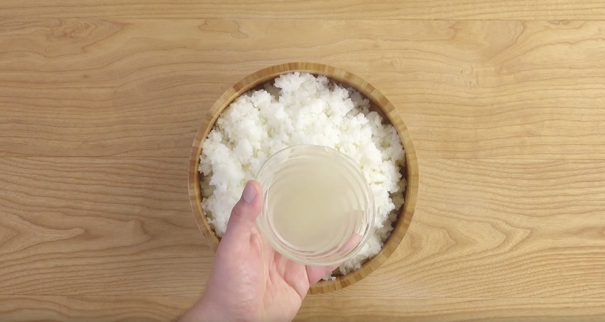 Vermische Reisessig, Zucker und Salz miteinander und mariniere damit den Reis, den du zuvor vom Topf in eine Schüssel umgefüllt hast. Achte darauf, den Reis vorsichtig umzurühren, damit die Reiskörner dabei nicht zerdrückt werden.