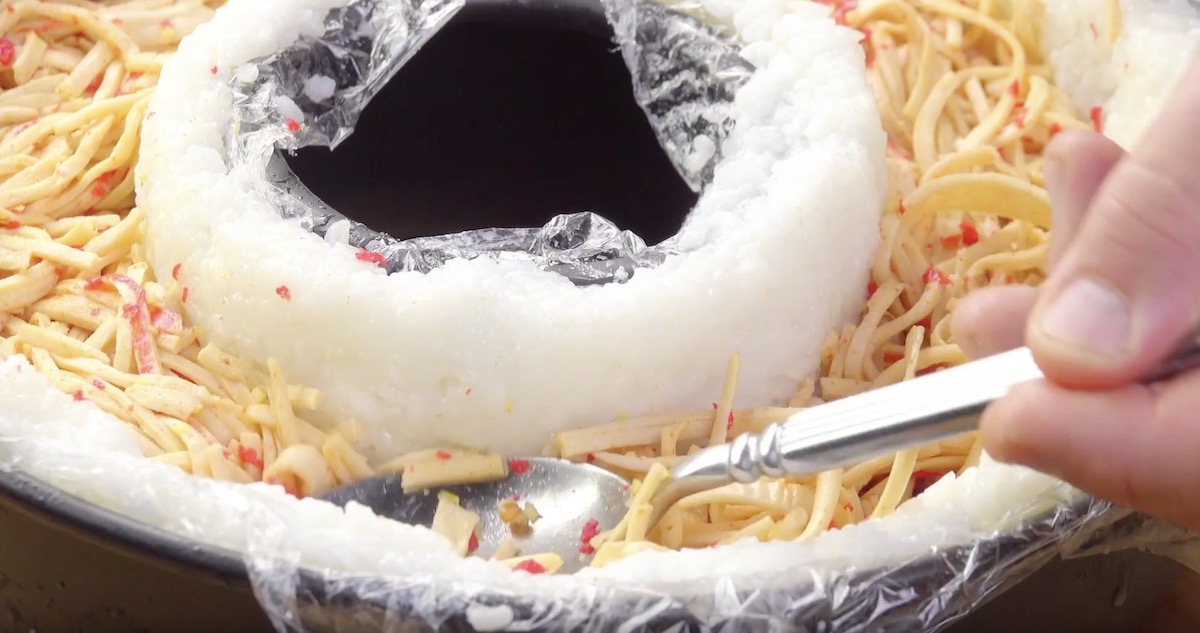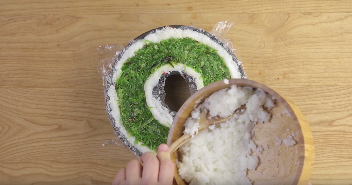5.) Anschließend gibst du den japanischen Algensalat in die Form, bevor du den restlichen Reis oben auf der Form verteilst und mit angefeuchteten Fingern andrückst.