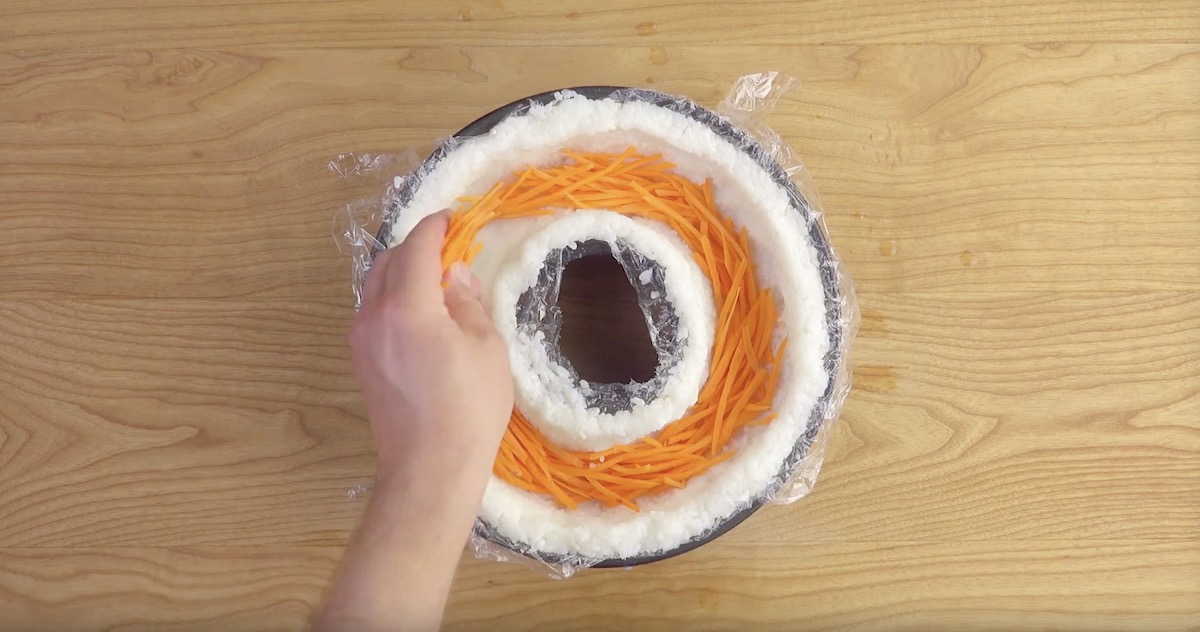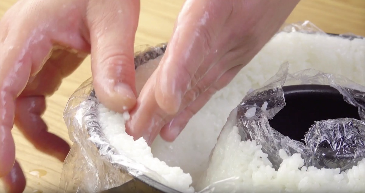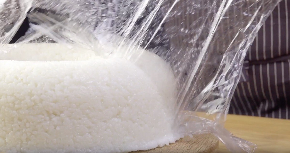 2.) Kleide eine Gugelhupfform (28 x 7 cm) mit Frischhaltefolie aus, befülle sie dann gleichmäßig mit ca. zwei Dritteln des Reises und drücke diesen an den Rändern fest.