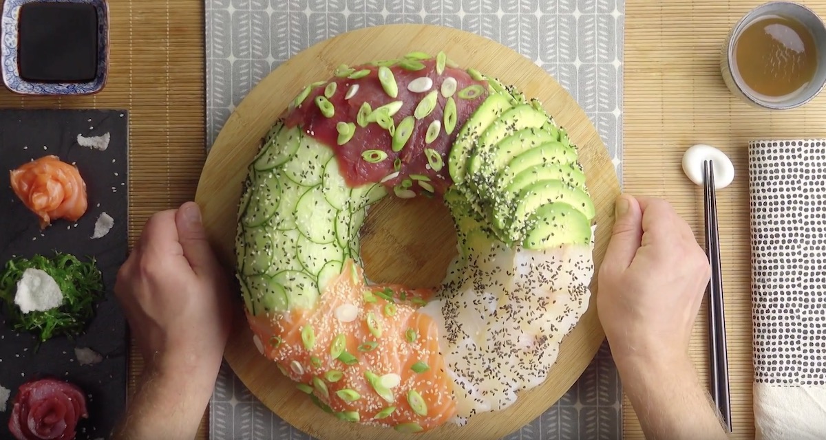 7.) Garniere den Kuchen nun abwechselnd mit Gurken, Thunfisch, Avocado, Zander und Lachs. Bestreue das Ganze abschließend noch mit Sesamkörnern und Frühlingszwiebeln – fertig ist der gigantische Sushi-Donut.