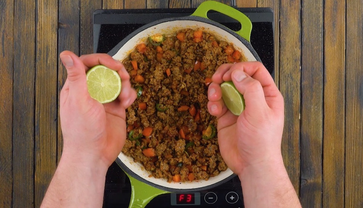 4.) Brate das Hackfleisch mit dem Gemüse und den Gewürzen für ca. 5-10 Minuten in einer Pfanne an. Am Schluss gibst du noch den Saft einer Limette darüber.