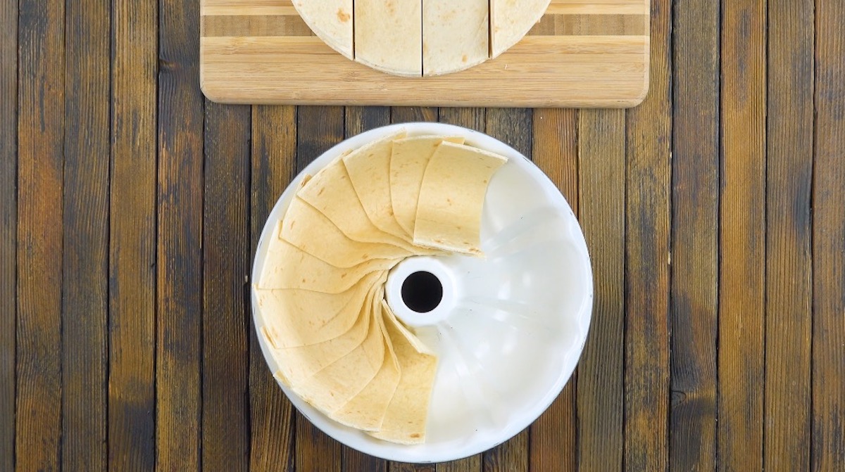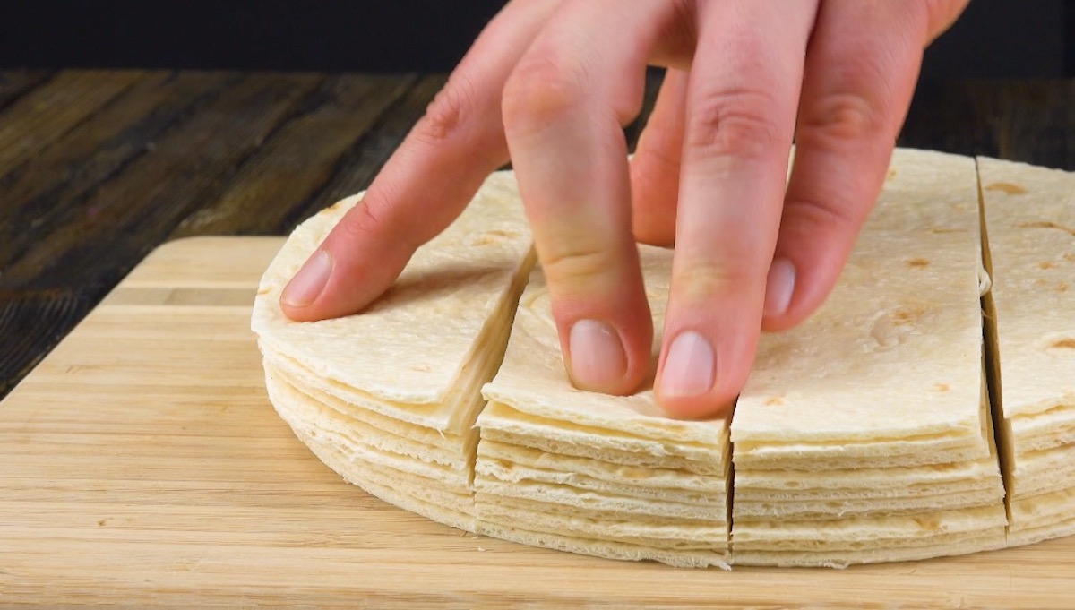 1.) Staple 10 Tortillas aufeinander und schneide sie in 4 Streifen. Da Tortillas rund sind, erhältst du zwei Mittelteile in nahezu rechteckiger Form und zwei Endstücke mit Rundung.