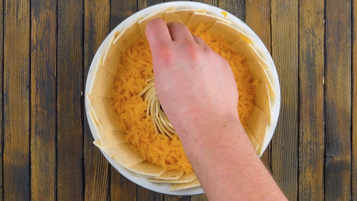 5.) Fülle die etwas abgekühlte fertige Hackmasse direkt auf den Cheddar. Auf das Hackfleisch kommt jetzt noch eine Lage der Tortillastücke mit Rundung.