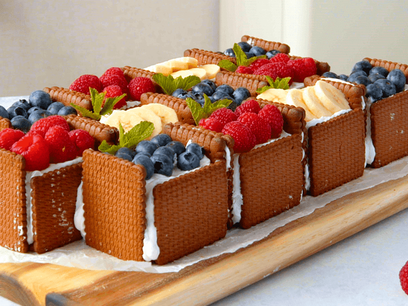 Butterkeks-Kuchen mit Frischkäsecreme und Schokokern