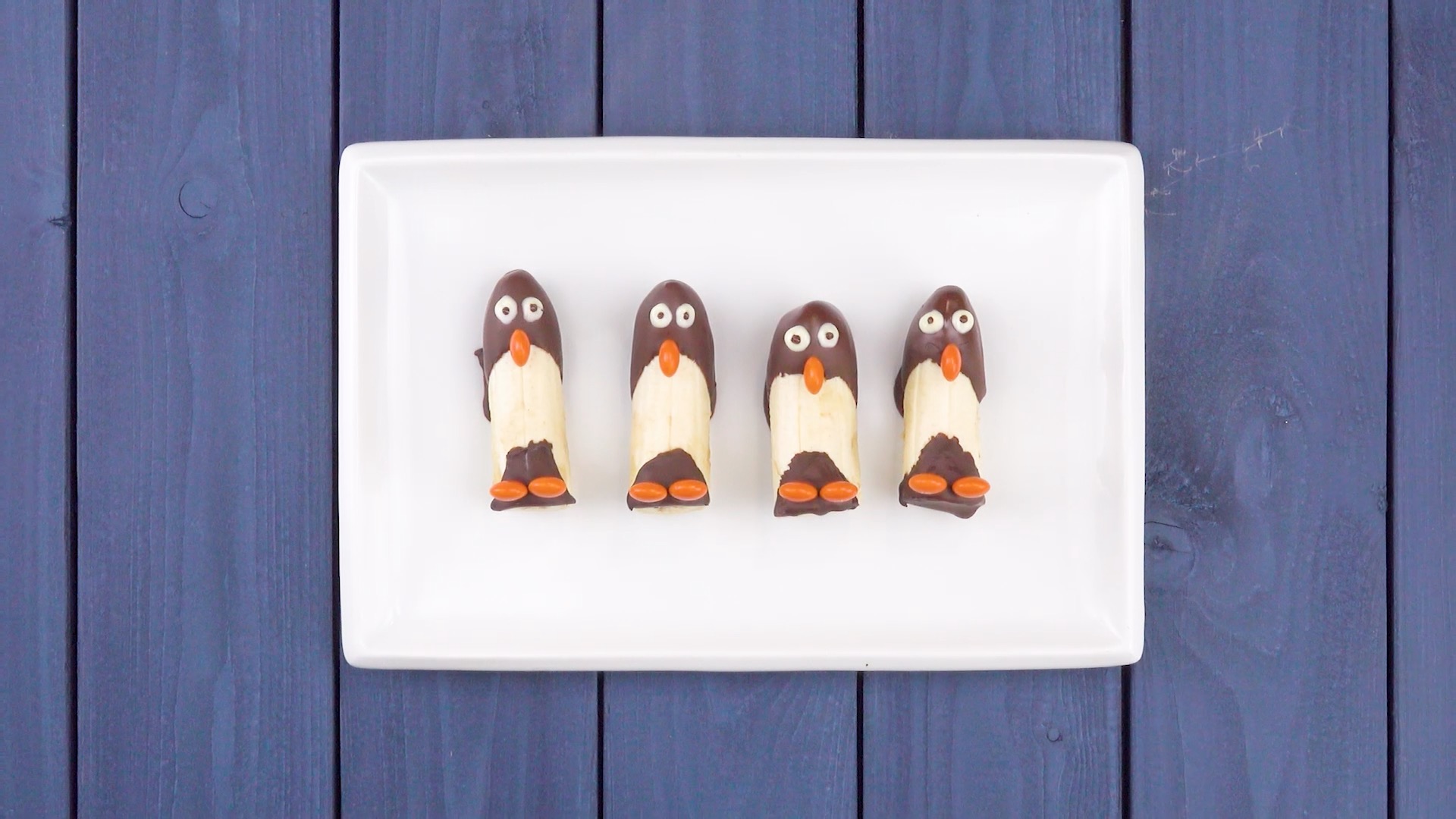 - Platziere auf der Schokolade jeweils ein M&M als Schnabel und zwei als Füße.
