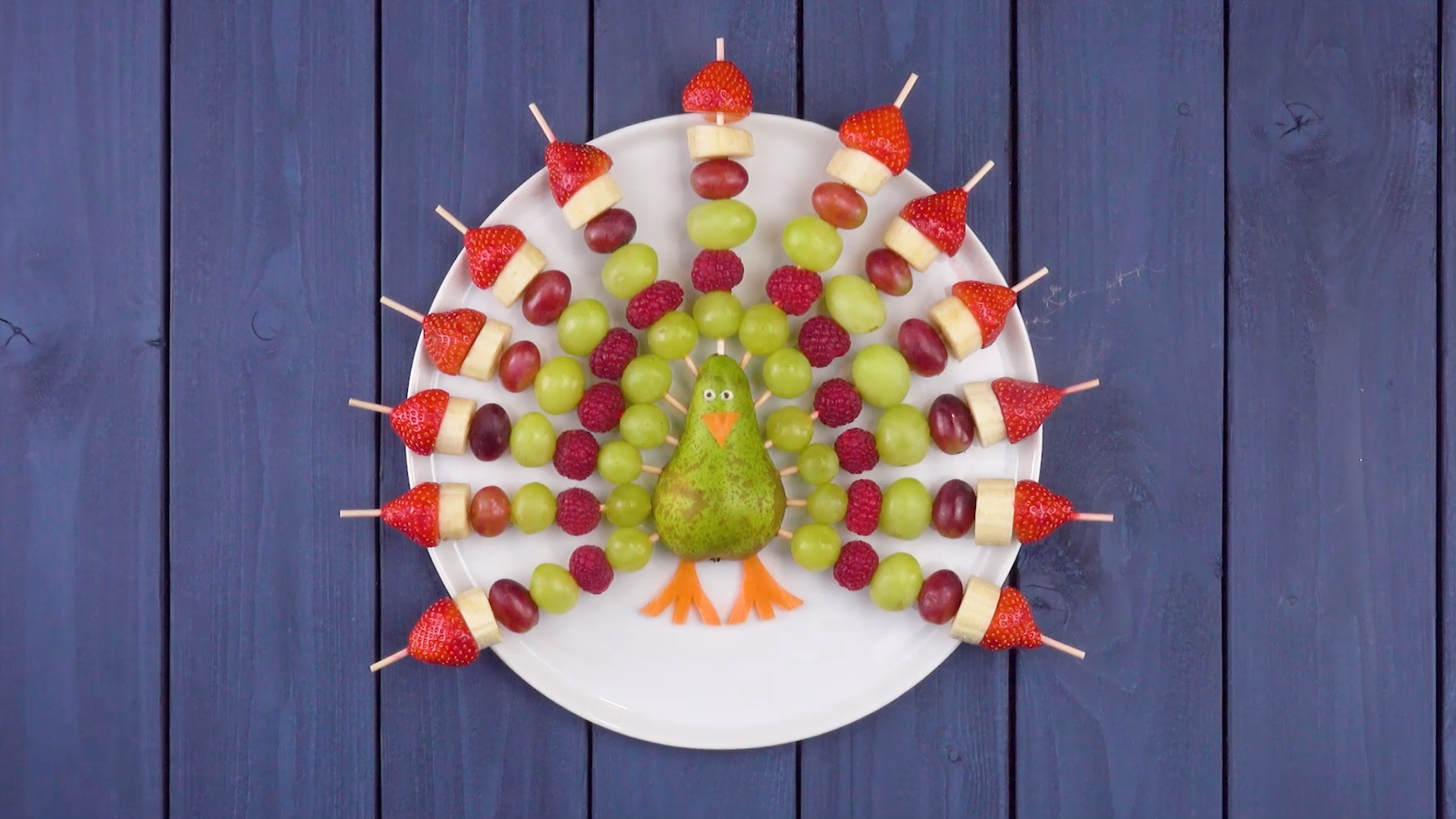 - Pike die verschiedenen Früchte auf Schaschlikspieße und stecke diese zu einem Halbkreis in die Birne.