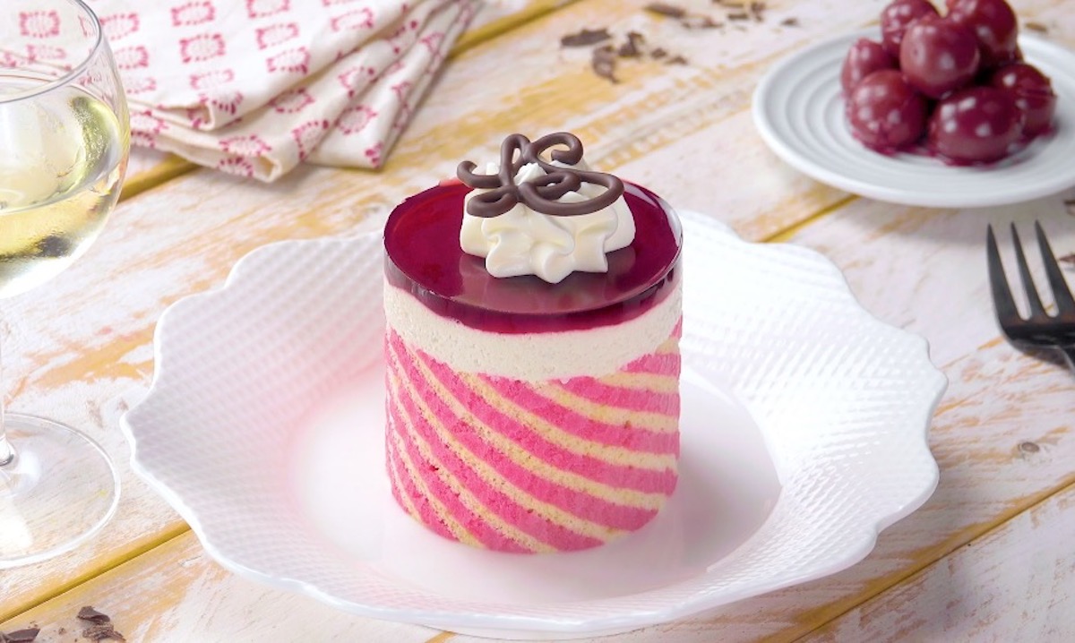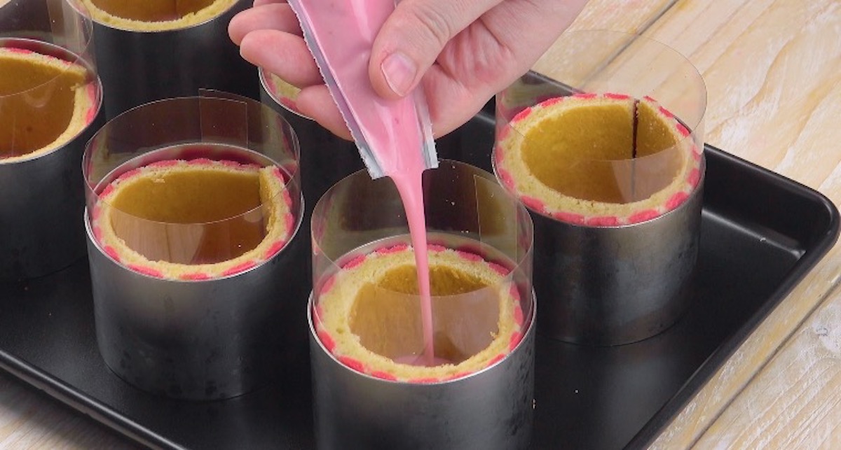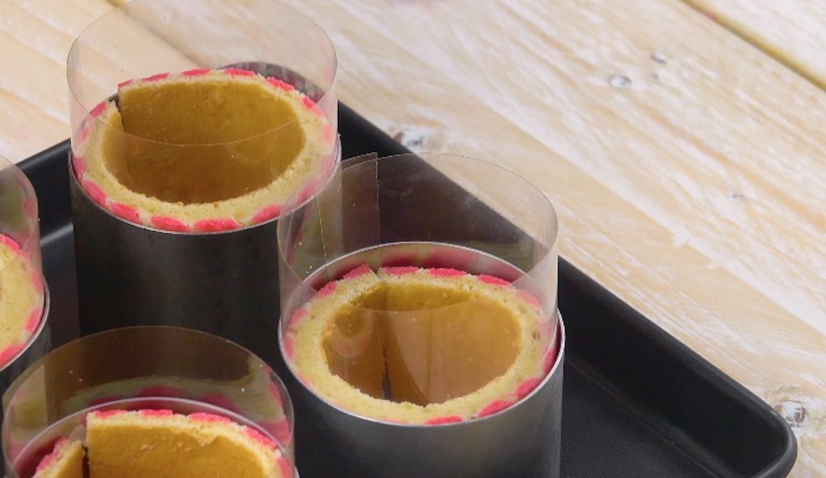 3.) Hole das Backpapier mit der gefrorenen roten Masse aus dem Eisschrank und verstreiche den Biskuitteig zügig und gleichmäßig darauf. Schiebe das Blech für ca. 10 Minuten in den Ofen. Dann holst du es wieder heraus und stürzt es, sodass die roten Streifen oben sind. Ziehe vorsichtig das Backpapier ab und lass den Teig kurz abkühlen. Nun schneide den Teig in breite Streifen (5 x 21 cm). Aus dem restlichen Teig stichst du kleine Kreise mit ca. 5 cm Durchmesser aus. Jetzt brauchst du die Dessertringe, die du auf eine Platte stellst und mit Tortenrandfolie oder Backpapier auskleidest, sodass oben etwas übersteht. Lege die Teigstreifen mit dem Streifenmuster nach außen in die Ringe. Achte darauf, dass die Schnittenden dicht abschließen. Lege je einen kleinen Teigkreis als Boden in den Ring und in die Mitte kommt auch noch eine Kirsche.