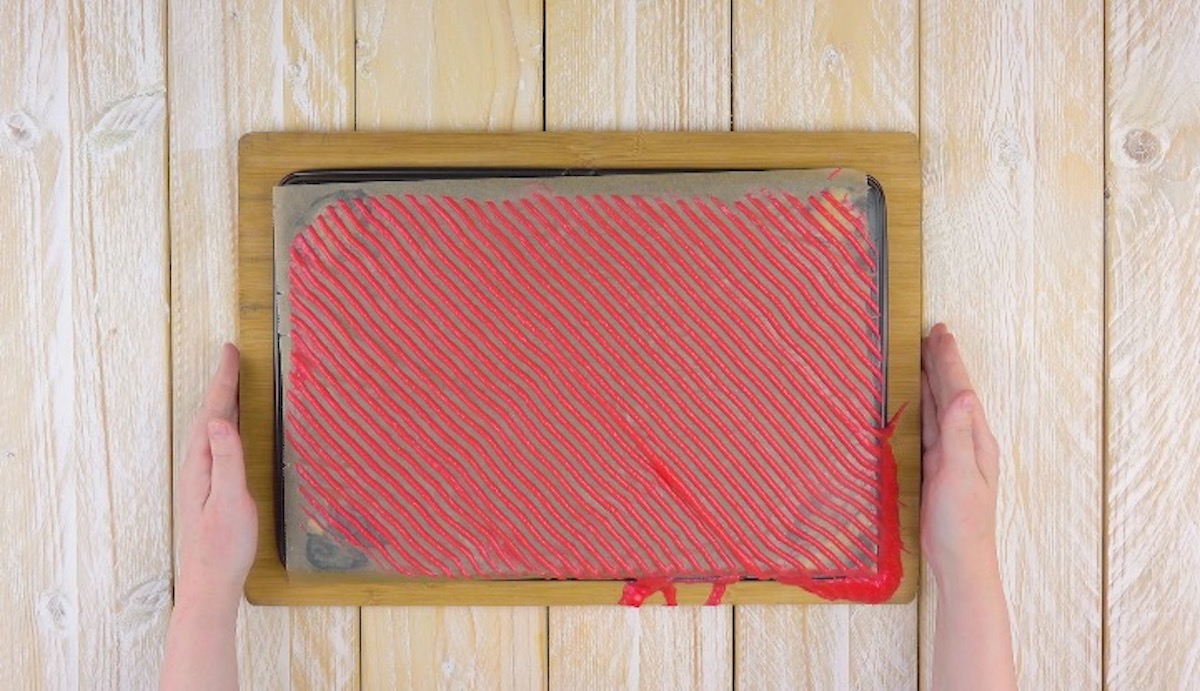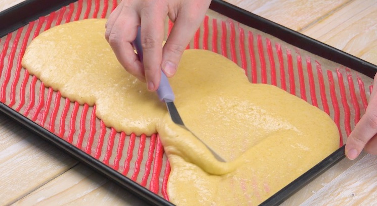 1.) Verrühre als Erstes Butter, Puderzucker und das ungeschlagene Eiweiß. Gib das Mehl und rote Lebensmittelfarbe hinzu. Streiche die Masse gleichmäßig 1–2 mm dünn auf 30×40 cm Backpapier. Jetzt kommt ein Werkzeug zum Einsatz, das eigentlich nicht in die Küche gehört: ein Zahnspachtel. Diesen Spachtel ziehst du diagonal durch die farbige Masse, sodass ein Streifenmuster entsteht. Diese roten Streifen lässt du auf dem Backpapier und stellst sie mindestens 1 Stunde lang in den Gefrierschrank, damit das Muster später nicht verschmiert.