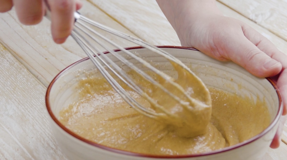 4.) Erhitze nun die Butter in einem Topf oder der Mikrowelle so lange, bis sie flüssig ist, gib sie dann zu dem Teig hinzu und rühre diesen um, bis er cremig ist.