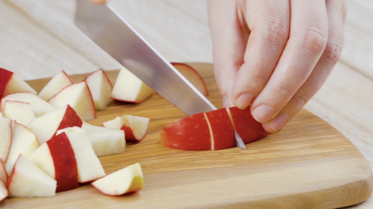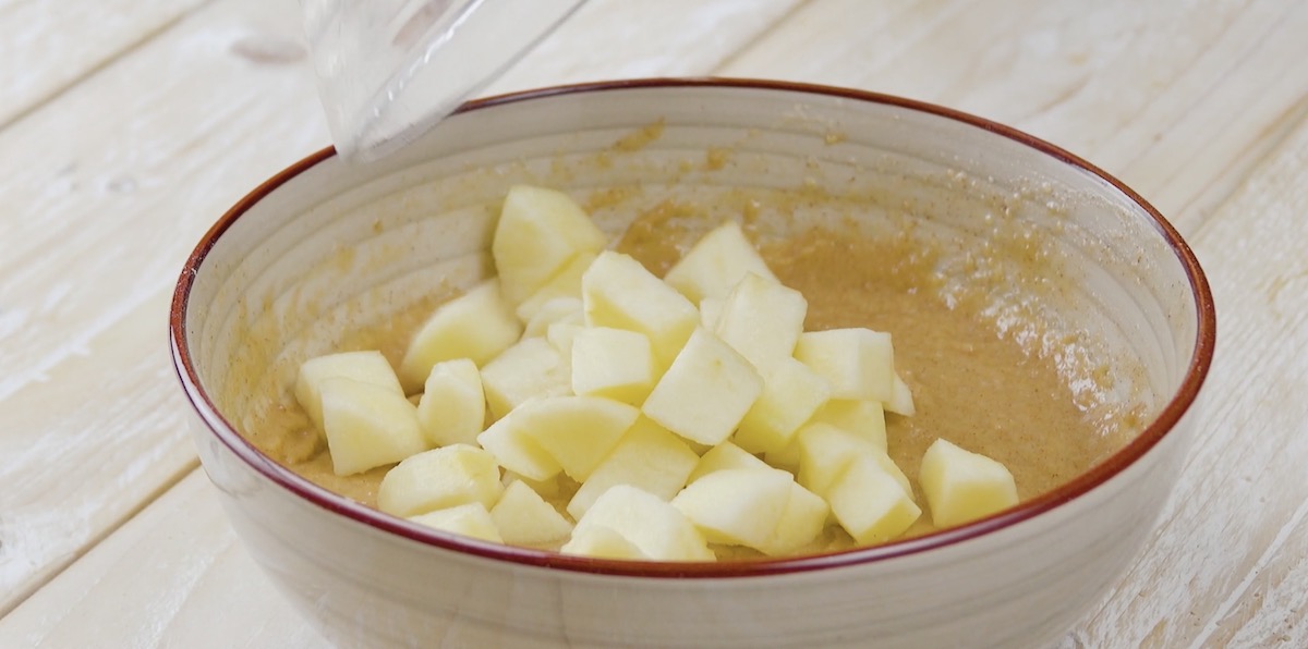 5.) Erinnerst du dich noch an den halben Apfel, den du am Anfang zur Seite gelegt hast? Diesen musst du nun schälen, entkernen sowie in Stücke schneiden und anschließend mit dem cremigen Teig verrühren.