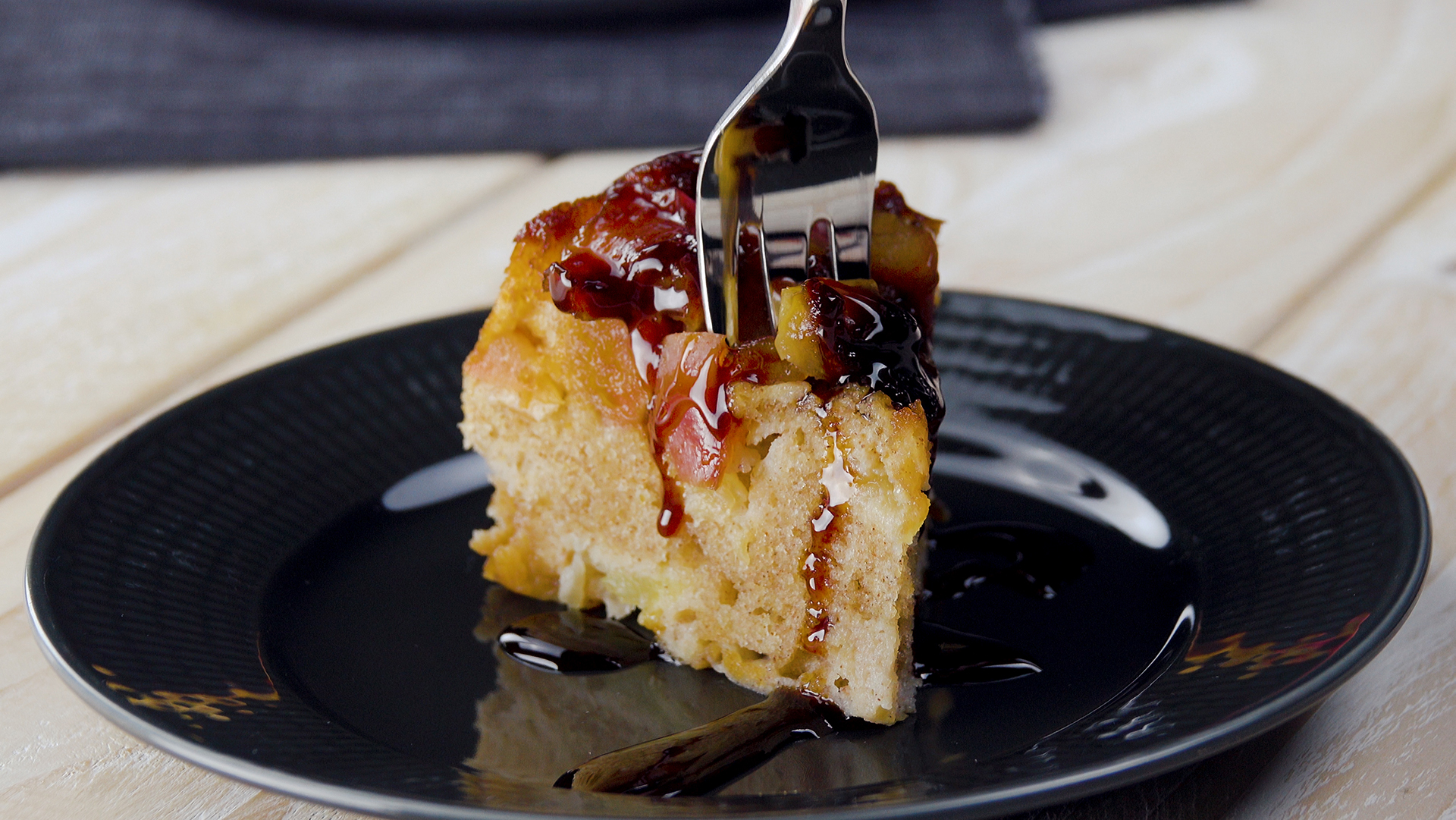 7.) Zu guter Letzt nimmst du einen Teller und stürzt den Kuchen direkt aus dem Topf darauf. Doch Vorsicht, der Topf ist heiß! Also denk bitte daran, den Kuchen nur mit Topflappen oder -handschuhen zu stürzen!