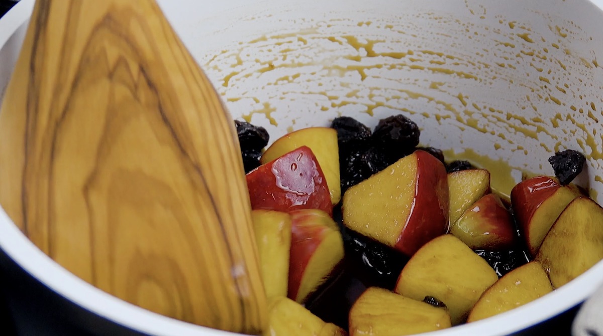 2.) Gib diese Apfelstücke zusammen mit den Rosinen in einen Topf und karamellisiere das Ganze für etwa eine Minute mit dem Zuckerrübensirup.