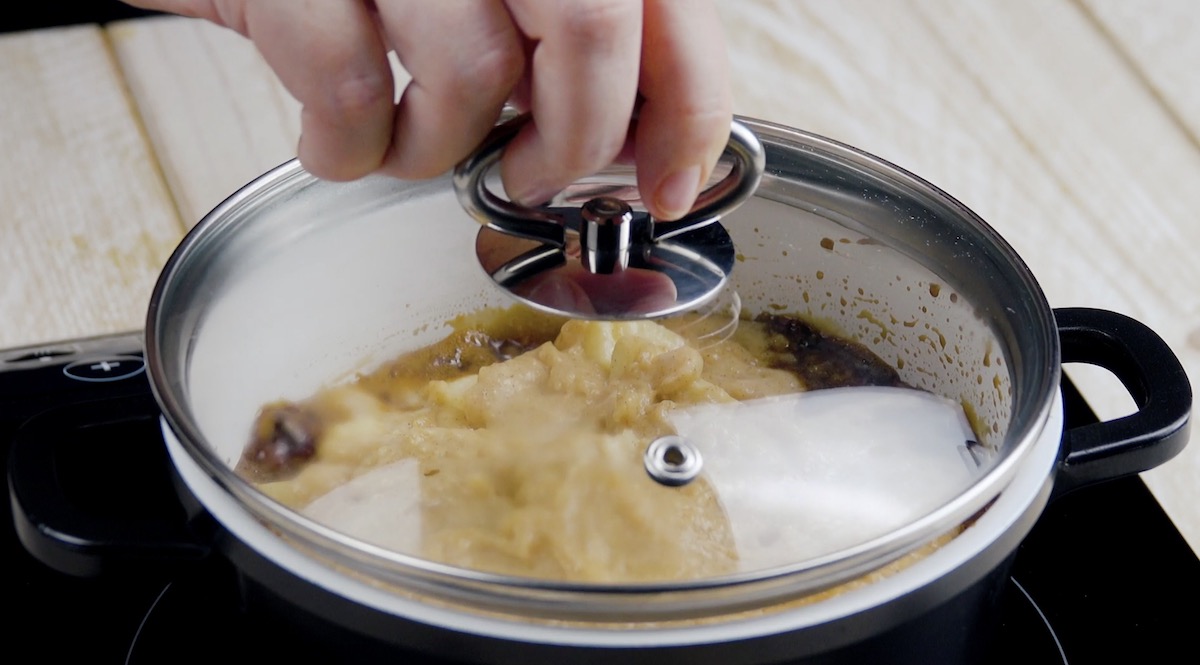 6.) Den Teig gibst du nun über die karamellisierten Äpfel und Rosinen in den Topf und lässt das Ganze für 25 Minuten zugedeckt bei kleiner Hitze köcheln.