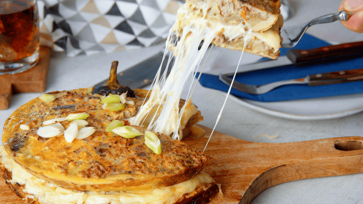 5. Verteile nun auf eines der beiden Auberginenomeletts den geriebenen Käse. Platziere das zweite Auberginenomelett darauf und lass alles zusammen weitere 5 Minuten bei geschlossenem Deckel und mittlerer Hitze garen.