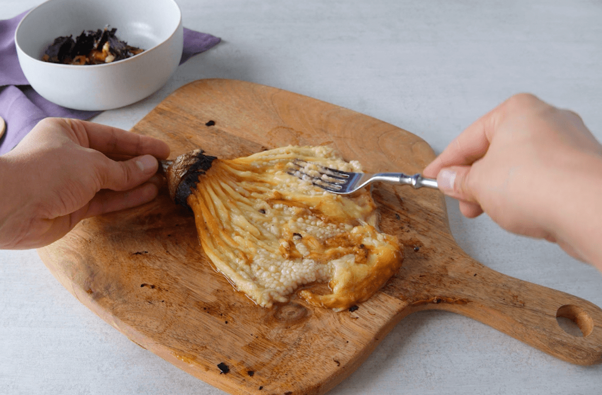 1. Halte die Auberginen über eine Flamme (Gasbrenner oder Bunsenbrenner) und lass die Haut verkohlen. Schäle anschließend die Haut komplett vom Fleisch ab (achte darauf, dass der Strunk unversehrt bleibt). Plätte das Auberginenfleisch behutsam mit einer Gabel.