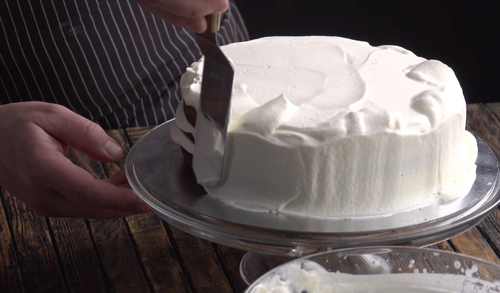 5.) Hebe im nächsten Schritt zunächst das Vanillearoma unter die geschlagene Sahne. Lege dann die erste Kuchenscheibe auf eine Platte und bestreiche sie großzügig mit Sahne. Darauf kommt die zweite Scheibe, die ebenfalls bestrichen wird und zuoberst die dritte. Bestreiche nun die Oberfläche sowie den Kuchen rundherum mit der übrigen Sahne. Stelle das cremige Werk anschließend kalt.