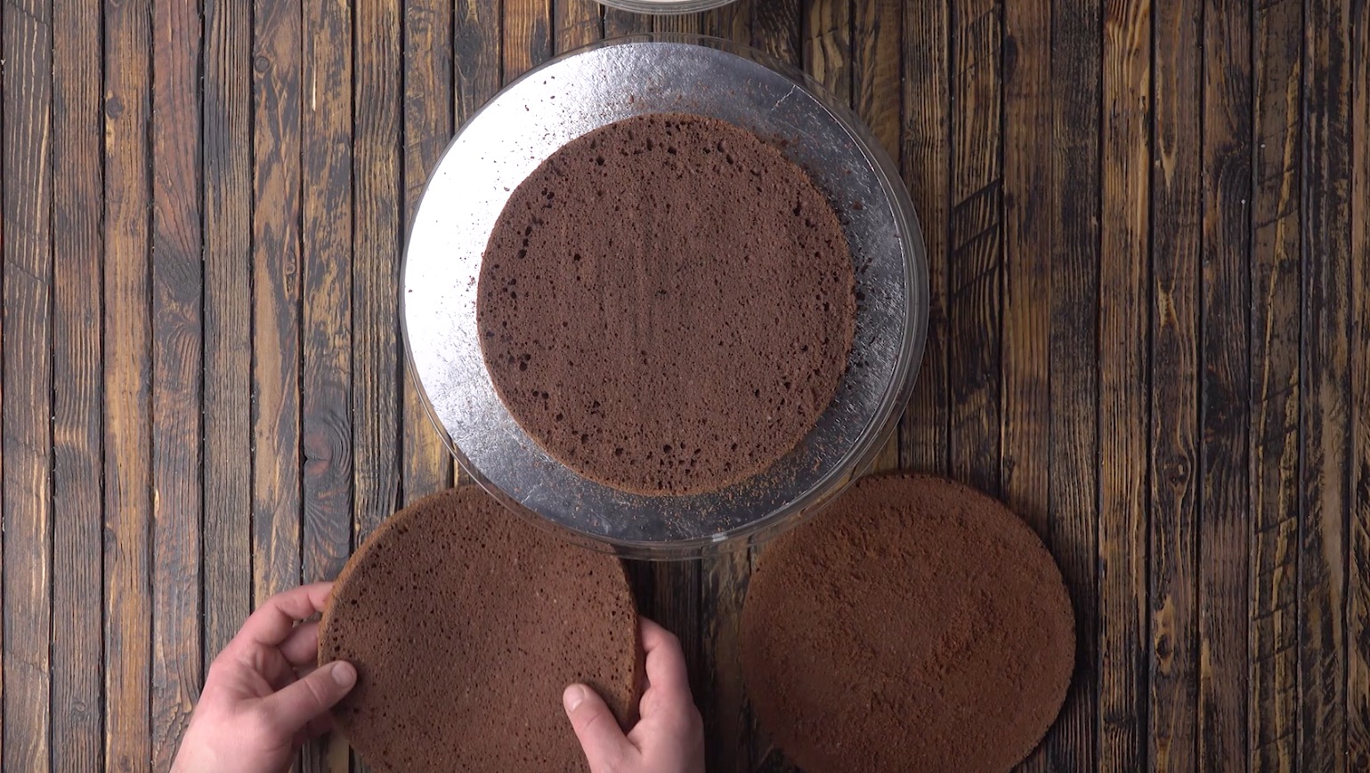 4.) Nachdem der Biskuitkuchen ausgekühlt ist, schneide ihn zweimal quer durch, sodass du drei gleich dicke Platten erhältst.