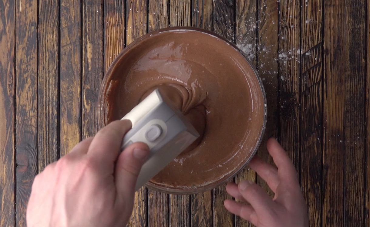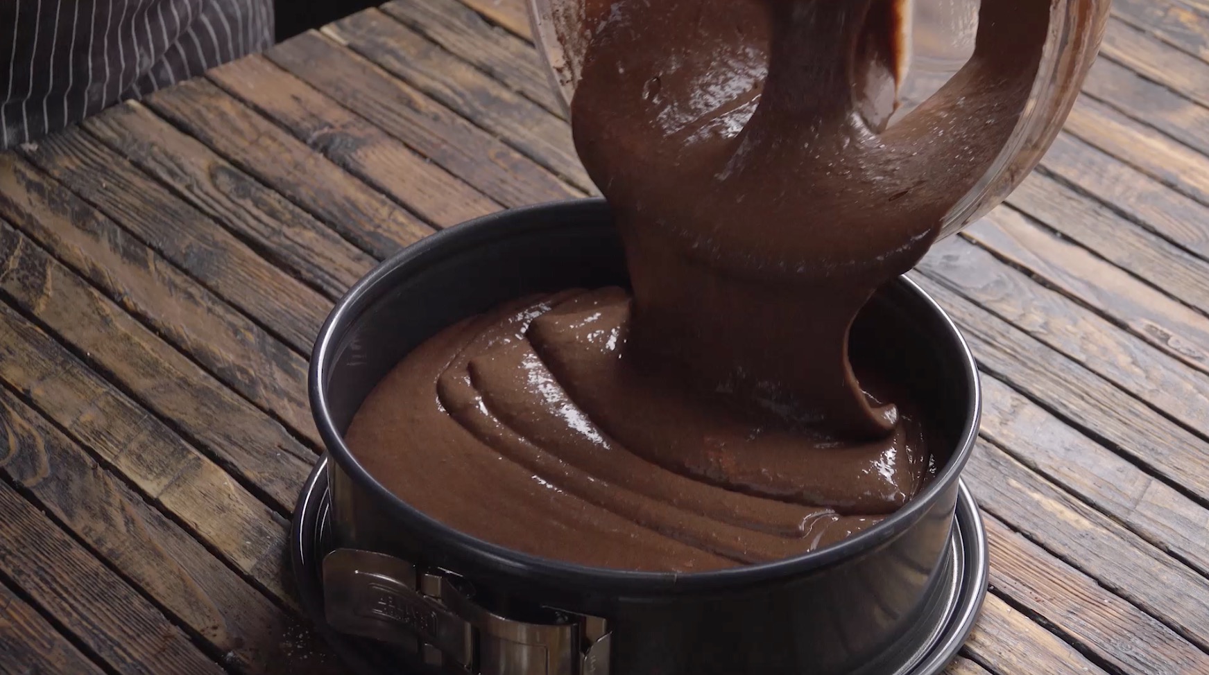 3.) Gib den dunklen Teig in eine gefettete Springform (Durchmesser: 22 cm) und backe ihn für 45 Minuten bei 175 °C Umluft.