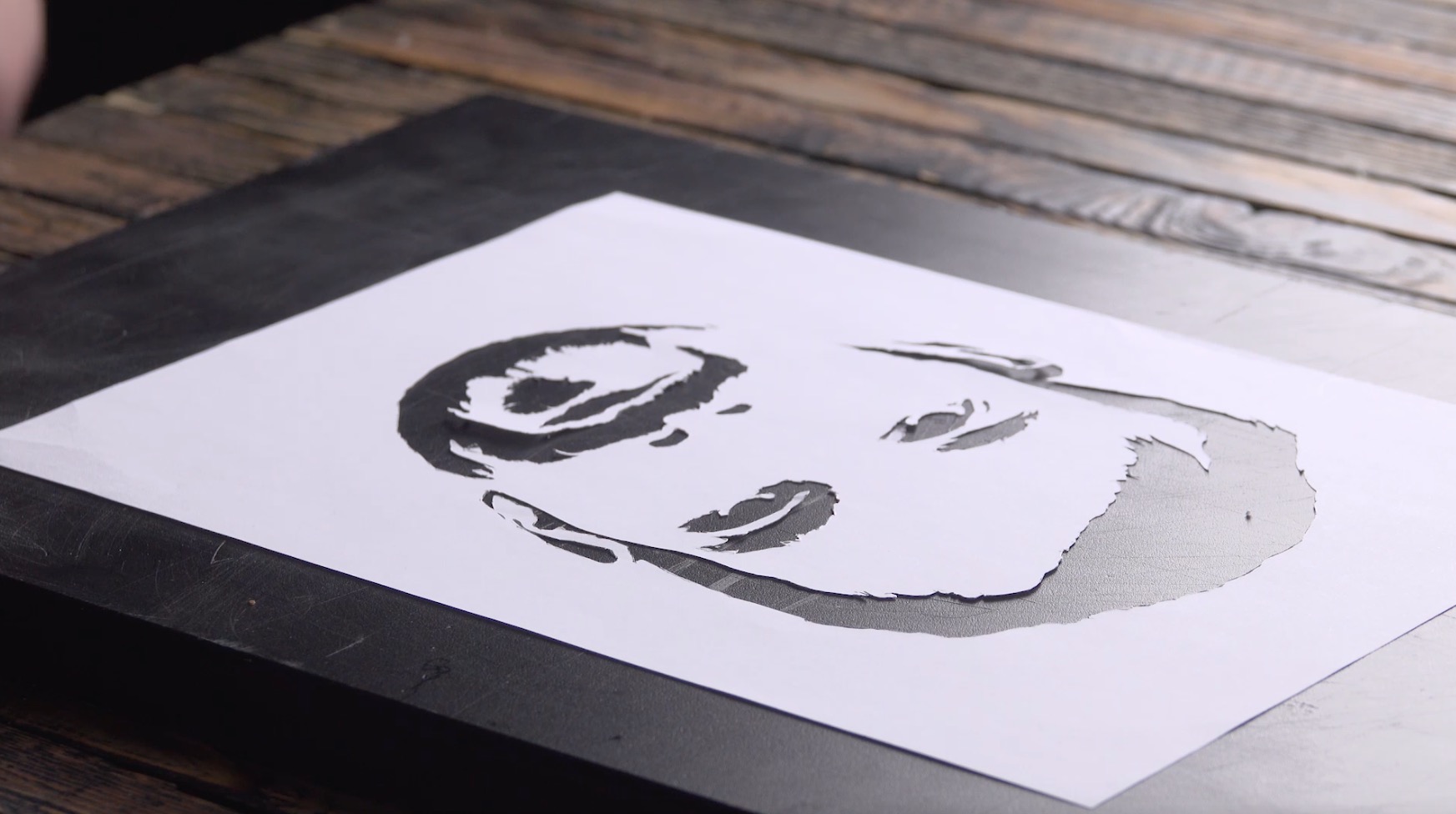 1.) Der erste Schritt findet tatsächlich noch nicht in der Küche statt: Drucke ein Foto mit dem Gesicht auf ein Din A4-Blatt aus. Wer sich ein wenig mit digitaler Bildbearbeitung auskennt, bringt vorher die Konturen durch Hervorhebung der Kontraste stärker zu Ausdruck (in diesem Video findest du eine Anleitung dafür). Es geht aber auch ohne solche technischen Spielereien. Schneide nun die markantesten Umrisse mit einem Bastelmesser aus. So erhältst du eine Schablone.
