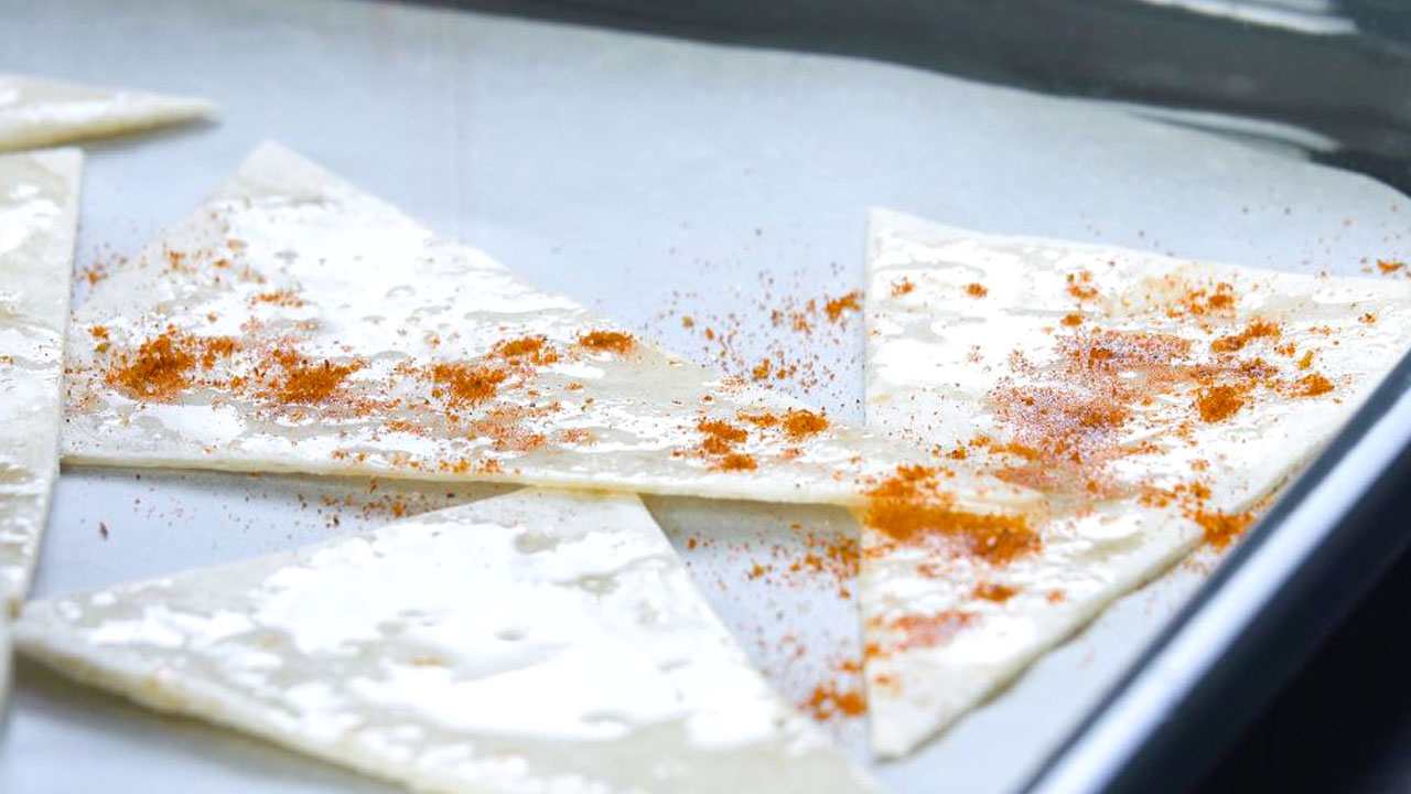 5. Stelle nun die Gewürzmischung her, indem du das Paprika- und Chilipulver, den Kreuzkümmel und das Salz miteinander vermischst. Bestreue anschließend die Dreiecke damit.