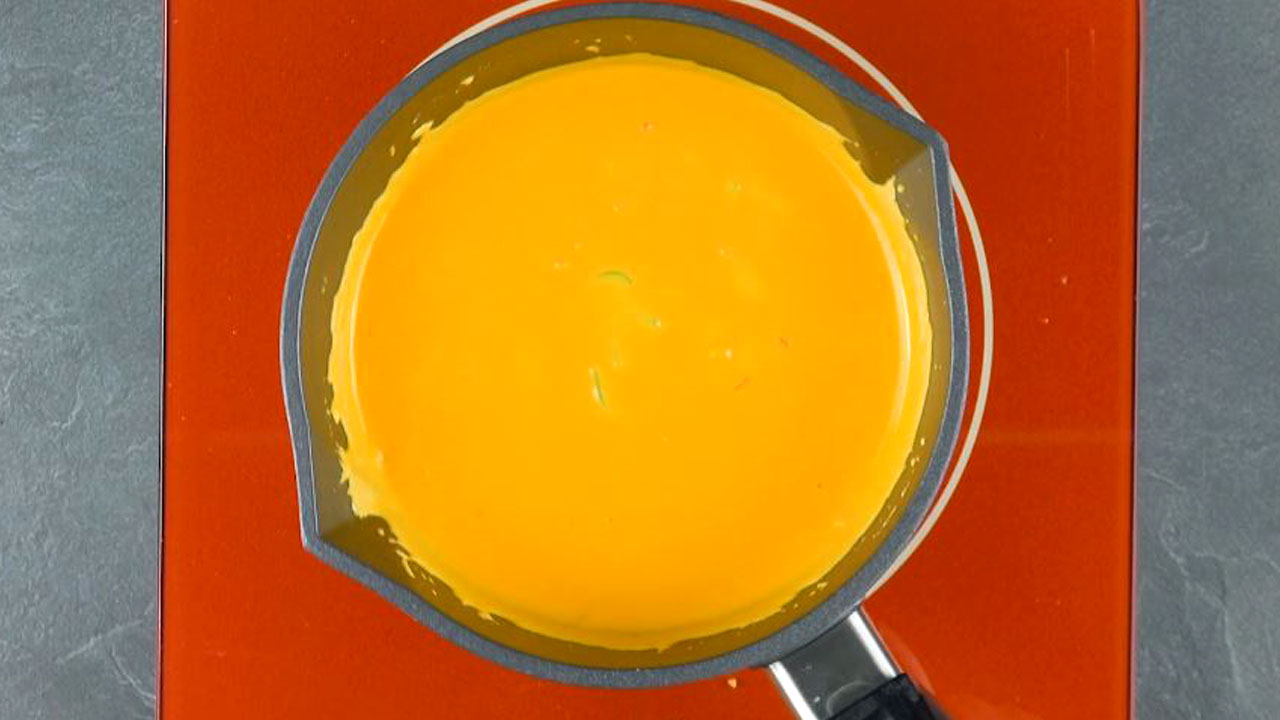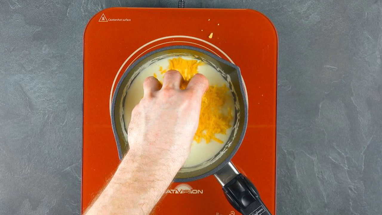 8. Schalte nach dem Aufkochen der Milch die Herdplatte aus und gib den geriebenen Käse hinzu.