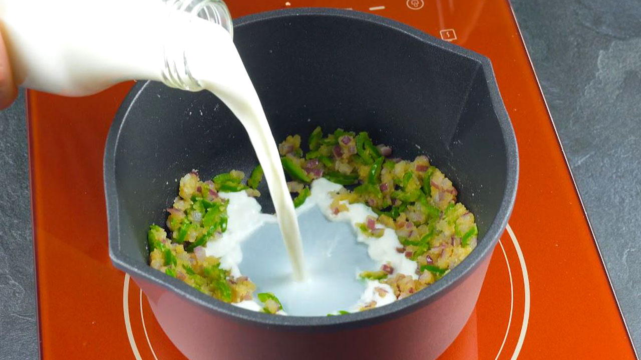 7. Bringe für den Käsedip die Butter in einem Topf zum Schmelzen und lass die Zwiebeln und Jalapeños darin glasig anziehen. Gib dann das Mehl hinzu und röste es kurz mit an. (Es soll aber dabei selbst keine Farbe bekommen.) Gieße danach die Milch in den Topf und lass sie unter ständigem Rühren aufkochen.