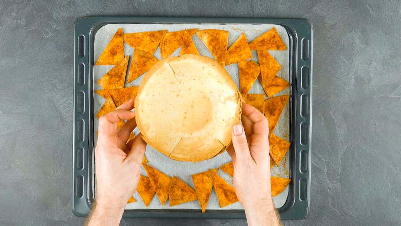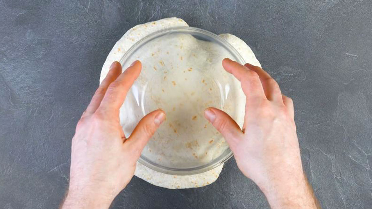 1. Platziere die kleinere Schüssel kopfüber auf deiner Arbeitsplatte, lege zwei der Tortilla-Wraps über sie und setze die größere Schüssel ebenfalls kopfüber auf die Wraps. Drücke die Schüssel dann langsam nach unten. So entsteht die spätere Wrap-Schale für den Dip.