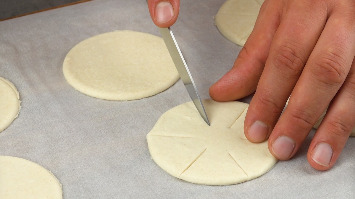 5.1 Stich aus einem fertigen Blätterteig Kreise aus. Ritze jeden Kreis sechsmal ein, achte jedoch darauf, die Mitte auszusparen.