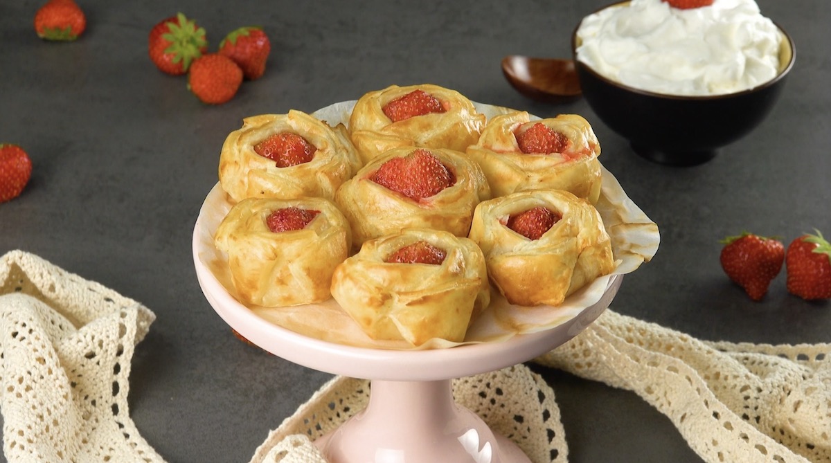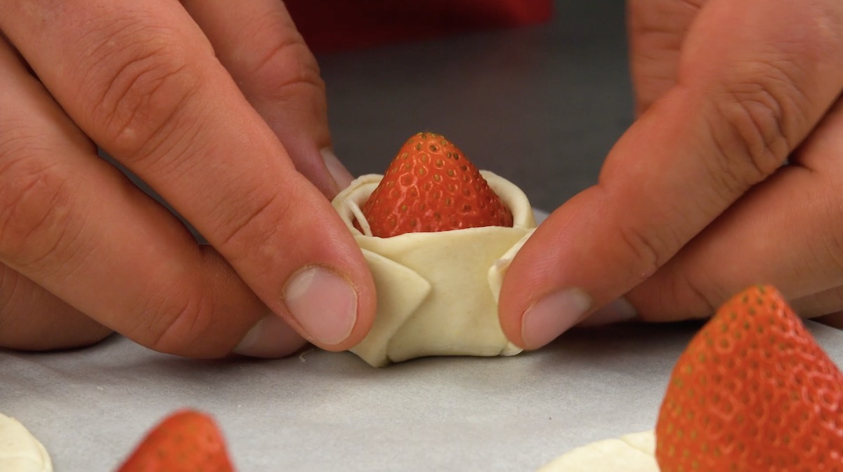 5.2 Platziere je eine Erdbeere auf der Mitte der Blätterteigkreise und wickle sie dann in den Blätterteig ein, indem du die zuvor eingeritzten Teigstücke hochklappst.