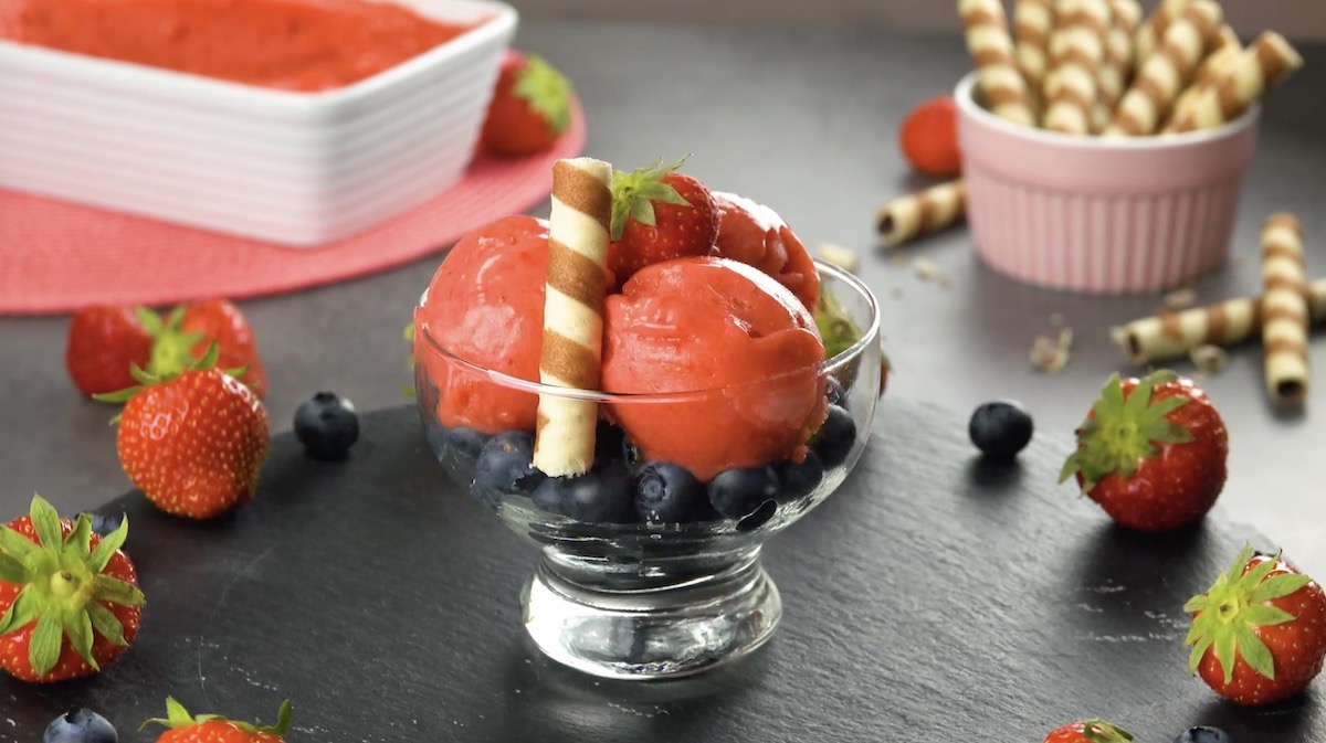 Friere 500 g Erdbeeren ein. Lass die Früchte anschließend kurz antauen und püriere sie zusammen mit 1 EL Honig (ca. 90 g) zu einem Sorbet. In Kombination mit Blaubeeren schmeckt das selbstgemachte Erdbeersorbet hervorragend.