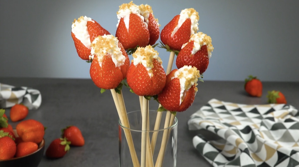 Du kannst aus Erdbeeren ganz einfach auch leckere Lutscher machen. Stich dafür einfach einen Holzstab in jede Erdbeere und schneide ein X in das spitze Ende der Früchte. Drücke die eingeschnittenen Spitzen vorsichtig auseinander und sprühe Schlagsahne hinein. Garniere die Erdbeeren am Stiel abschließend mit Kekskrümeln.