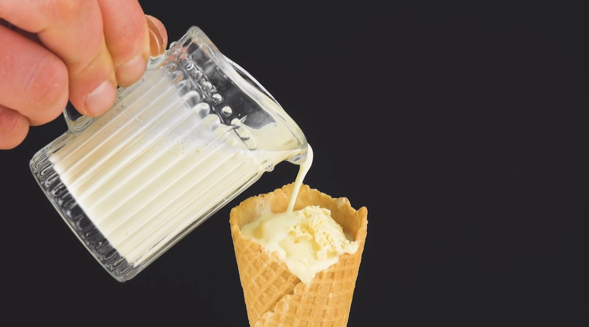 4.) Gieße nun heiße Sahne über das Vanilleeis, sodass es zusammen mit der Sahne durch das kleine Loch in der Waffelspitze in die Packung mit den Twix-Stückchen fließen kann.