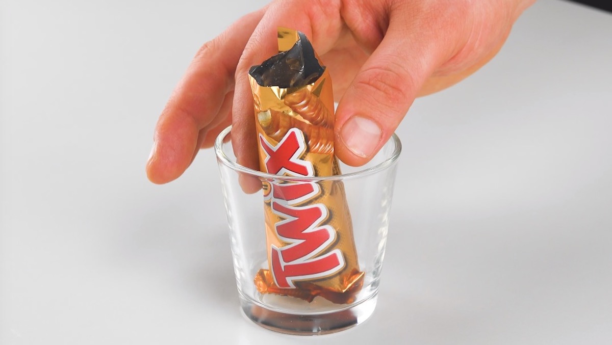 1.) Schlage mit einem Hammer auf die noch verpackten Twix-Riegel, bis sie in große Stückchen zerbrochen sind. Alternativ dazu kannst du die Riegel auch an eine Tischkante drücken und mit den Händen beim Zerkleinern etwas nachhelfen.
