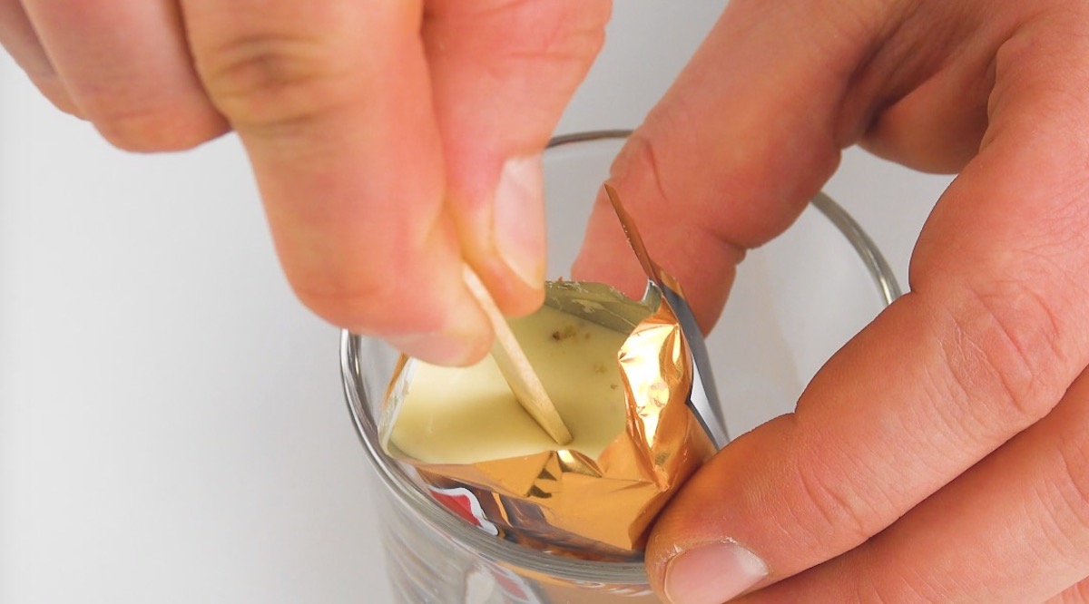 2.) Öffne das Papier an einer Seite und stelle den zerbrochenen Riegel in der Verpackung hochkant in ein Glas.