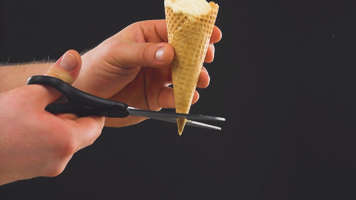 3.) Gib eine Kugel Vanilleeis in eine Eiswaffel und schneide das spitze Ende der Waffel mit einer Schere ab. Halte die Waffel über das Glas mit dem Twix.