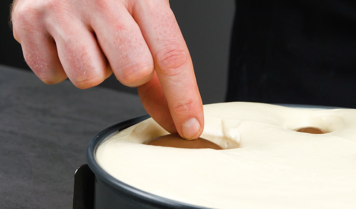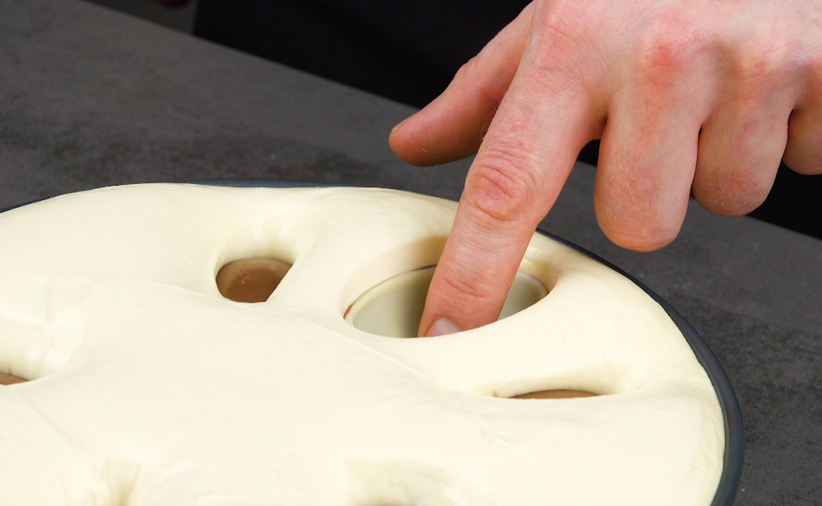5.) Drücke die gefüllten Ü-Eier in die Frischkäse-Masse in der Springform.