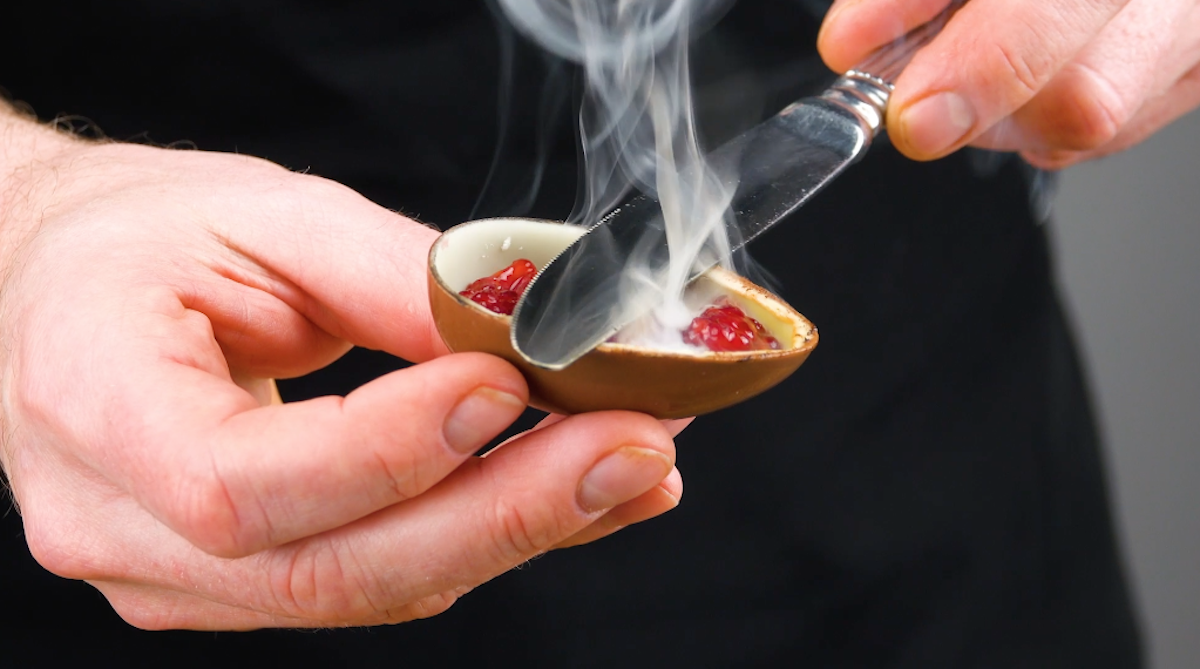 4.) Erhitze ein Messer und streiche mit dessen Seitenfläche über die Bruchkanten der Ü-Eier-Hälften. Setze die Hälften dann zusammen.