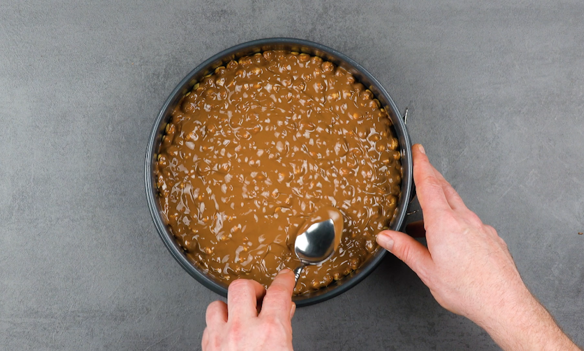 1.) Als Erstes müssen die Haselnüsse geröstet werden. Schiebe sie dafür auf einem mit Backpapier ausgelegten Backblech in den Ofen und röste sie für 10 Minuten bei 180 °C Umluft. Schmilz am besten in dieser Zeit die Vollmilchschokolade. Entferne anschließend mithilfe eines Tuches die Schale von den gerösteten Nüssen. Lege nun Backpapier in eine Springform, gib die Nüsse hinein und verteile geschmolzene Schokolade gleichmäßig darüber. Lasse alles abkühlen.