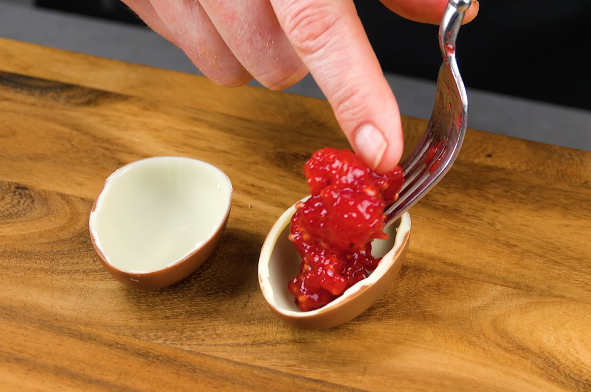 3.) Vermische Himbeeren mit Himbeermarmelade und zerdrücke alles mit einer Gabel. Halbiere die Ü-Eier und fülle die Hälften mit der Himbeer-Masse.