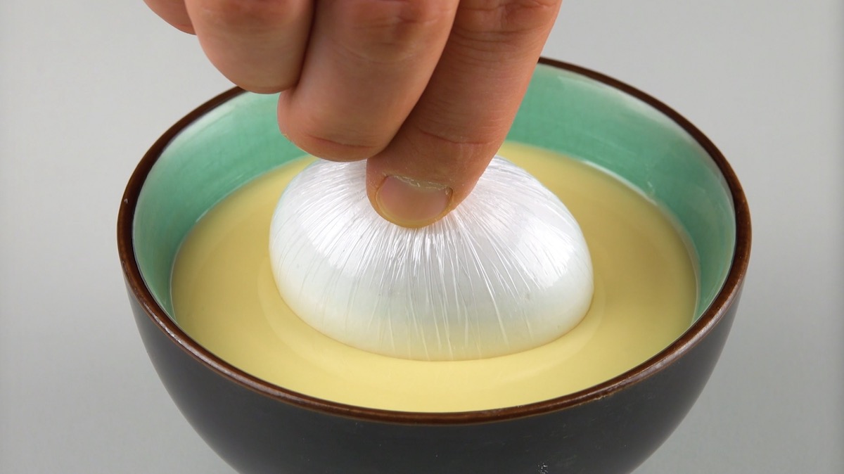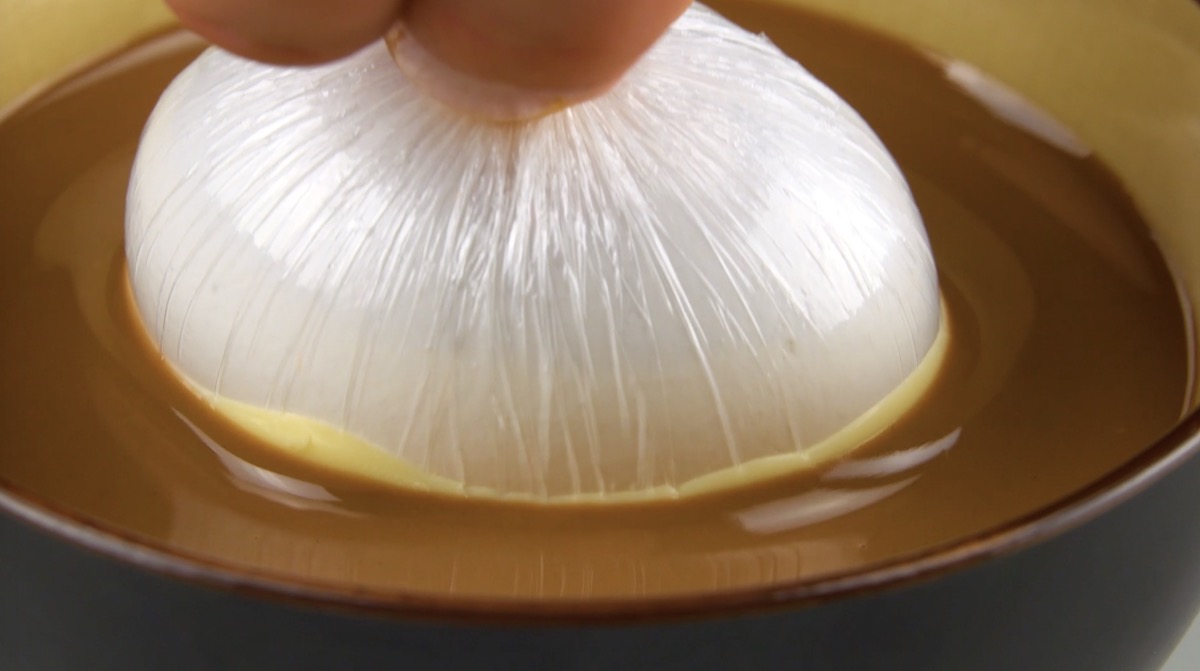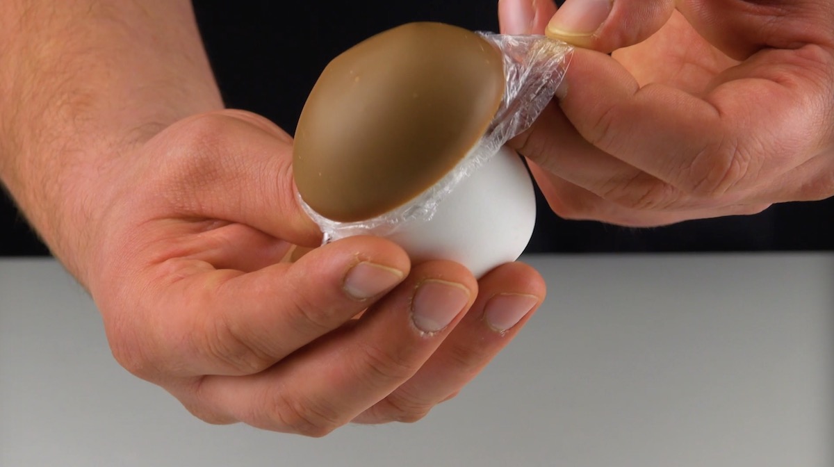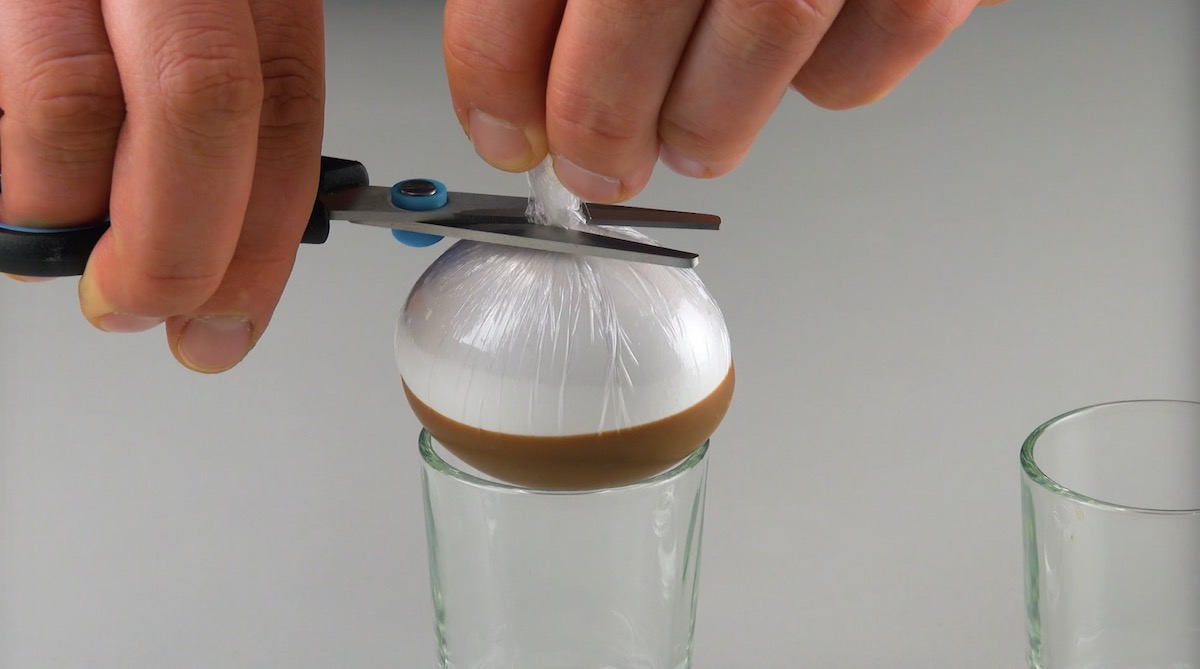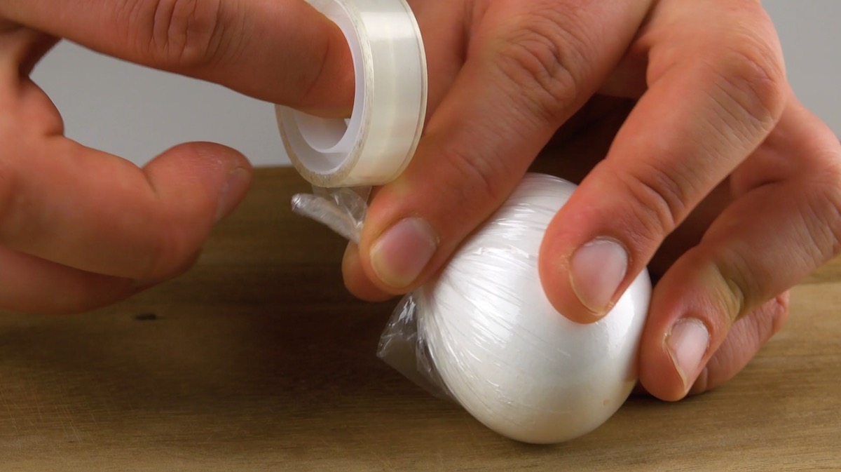 1.) Koche die Eier, bis sie hart sind, und schrecke sie ab. Lass die Eier abkühlen, wickle sie dann straff in Klarsichtfolie ein und verschließe den „Wickelzipfel“ mit Klebestreifen.