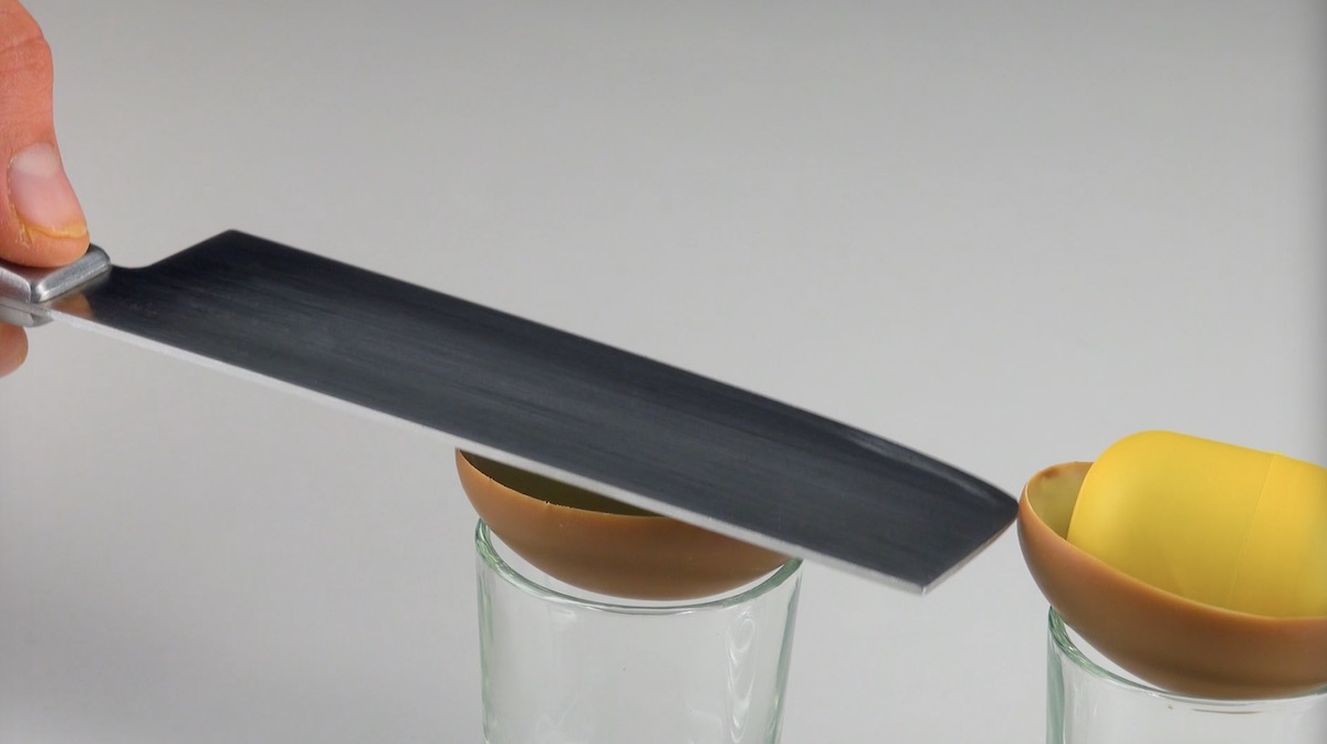 7.) Erhitze ein großes Messer z.B. unter heißem Wasser. Lege das Messer dann vorsichtig auf eine Schokoladen-Ei-Hälfte, damit die Ränder etwas weich werden.