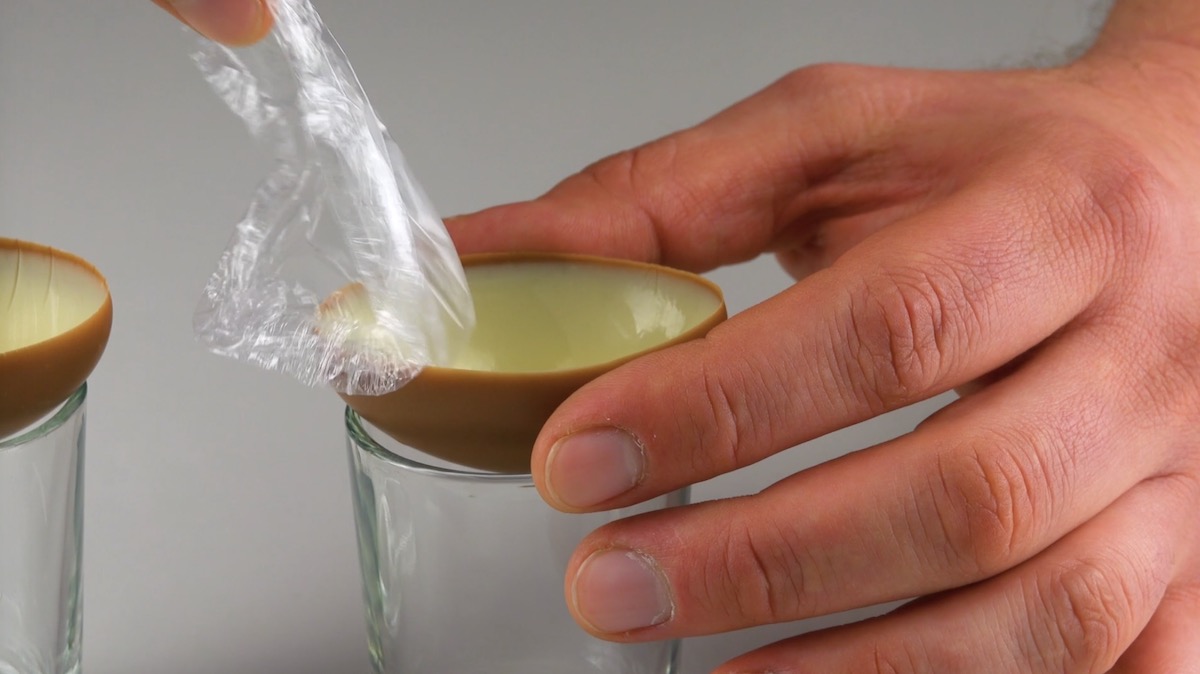6.) Ziehe die Klarsichtfolie vorsichtig von der Kuvertüre ab.
