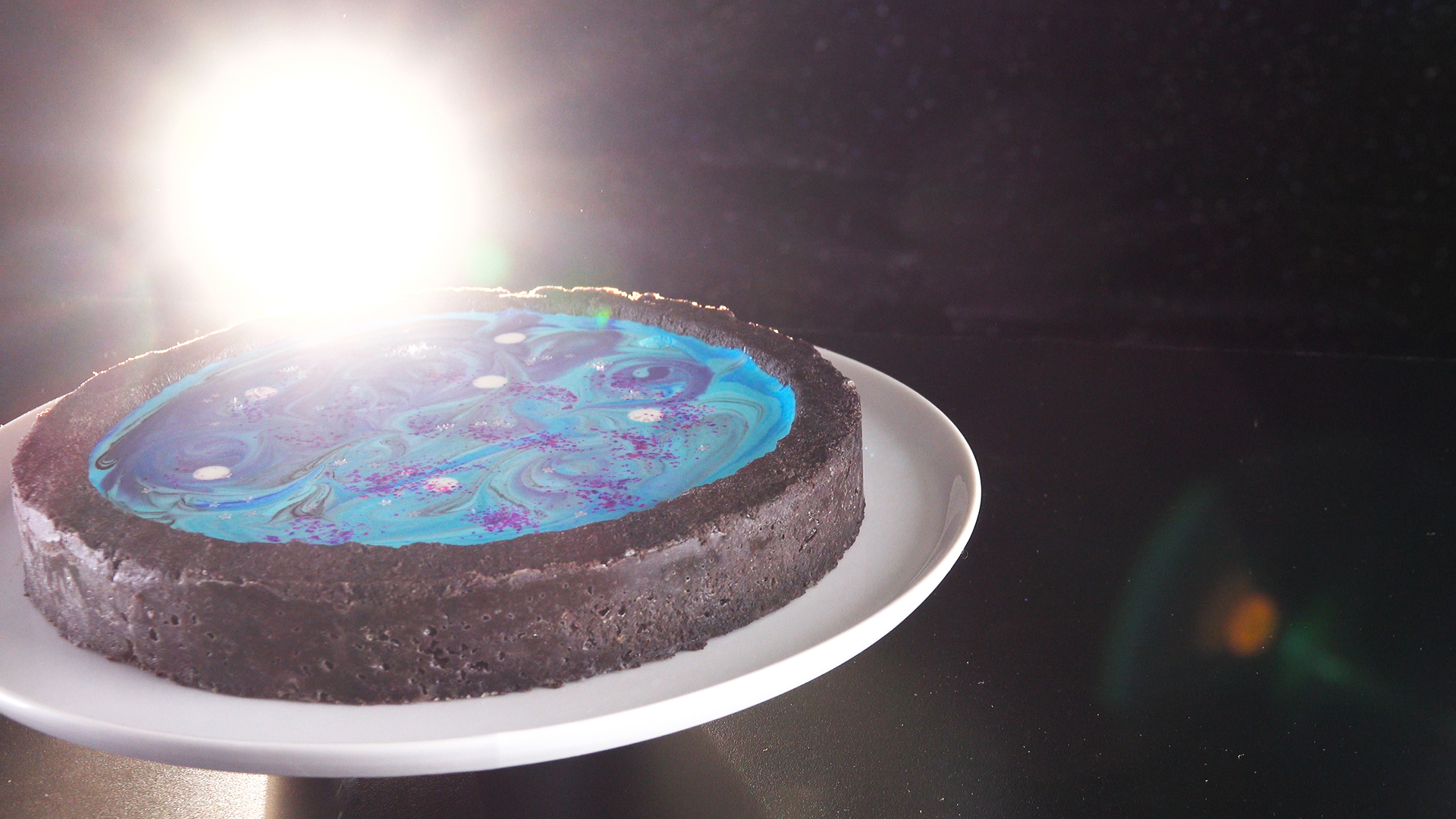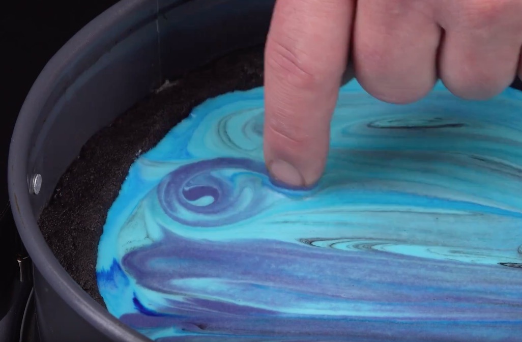 Nun kommt alles zusammen in die Kuchenform: Gib zuerst die blau-blaue Creme hinein und gieße dann die blau-schwarze Creme darauf. Mit der lila Creme kannst du deiner Fantasie freien Lauf lassen. Du kannst ein paar Linien auf die Creme gießen und dann mit einem Löffel verstreichen oder deinen Finger in die Farbe tunken und dann Kreise malen – Hauptsache, es entsteht auf der Kuchenoberfläche eine Art „Galaxie-Optik“.