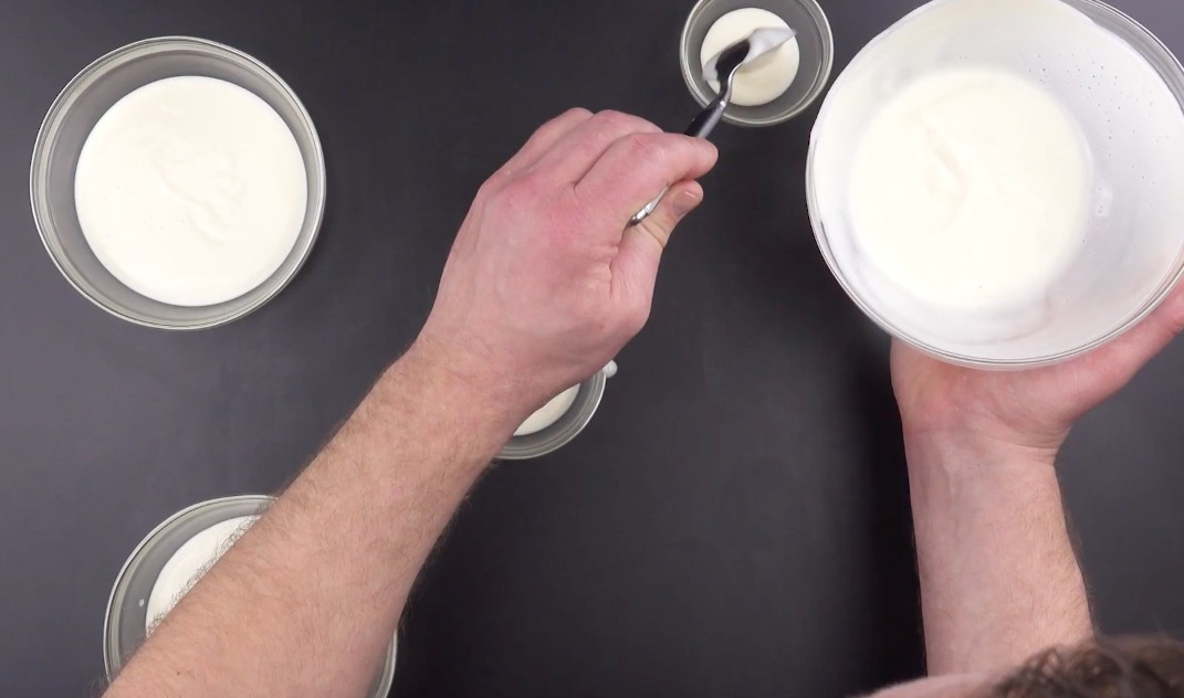 Dann verteilst du die Creme in insgesamt vier Schüsseln – zwei größere und zwei kleinere. Gib dementsprechend mehr Creme in die größeren Schüsseln.