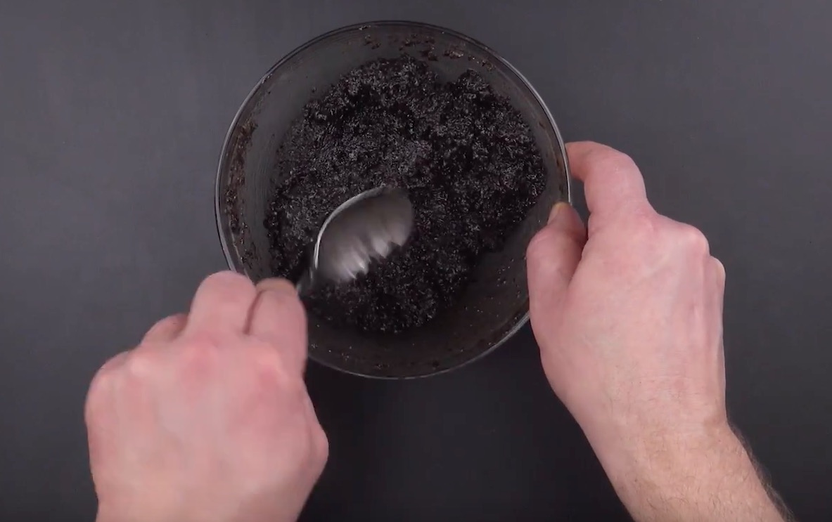 Zuerst zerkleinerst du die Kekse zu feinen Krümeln. Das geht z.B. gut, indem du sie in einen wiederverschließbaren Plastikbeutel füllst und sie dann zerstößt. Mische die Krümel dann mit der Butter, sodass eine möglichst gleichmäßige Keksmasse entsteht.