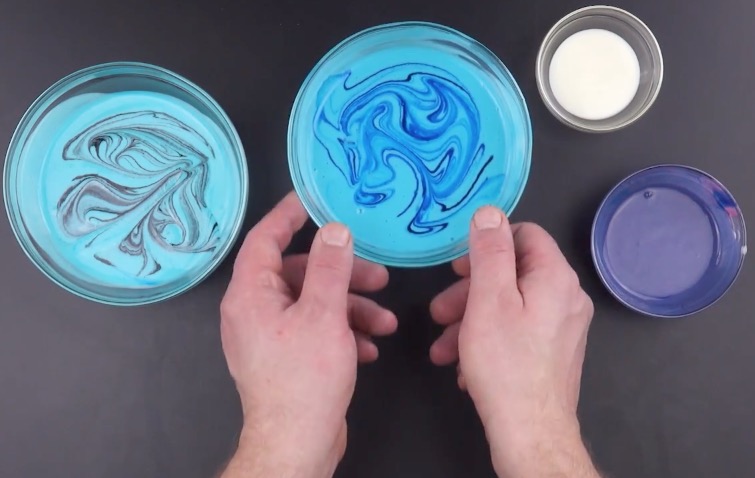 In die erste rührst du ein paar Tropfen blaue Lebensmittelfarbe ein, bis die Creme die Farbe komplett annimmt. Gib dann ein paar Tropfen schwarze Farbe hinzu, verteile sie aber nur leicht (z.B. mit einem Löffel), sodass sie Linien in der Creme hinterlässt. In der zweiten großen Schüssel rührst du wie in die erste ein paar Tropfen blaue Farbe ein. Gib ein paar weitere Tropfen blaue Farbe hinzu und verteile sie wie die schwarze Farbe in der ersten Schüssel.