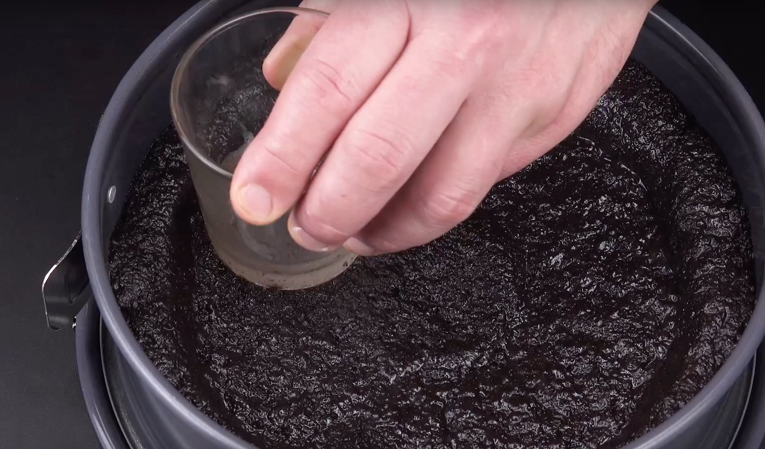 Fülle die Mischung dann in eine Springform. Drücke zuerst mit einem Löffel den Boden fest und forme dann einen dicken Rand damit. Diesen kannst du noch fixieren, indem du ihn rundherum mit einem Glas andrückst. Stelle die Form dann eine Stunde kalt.