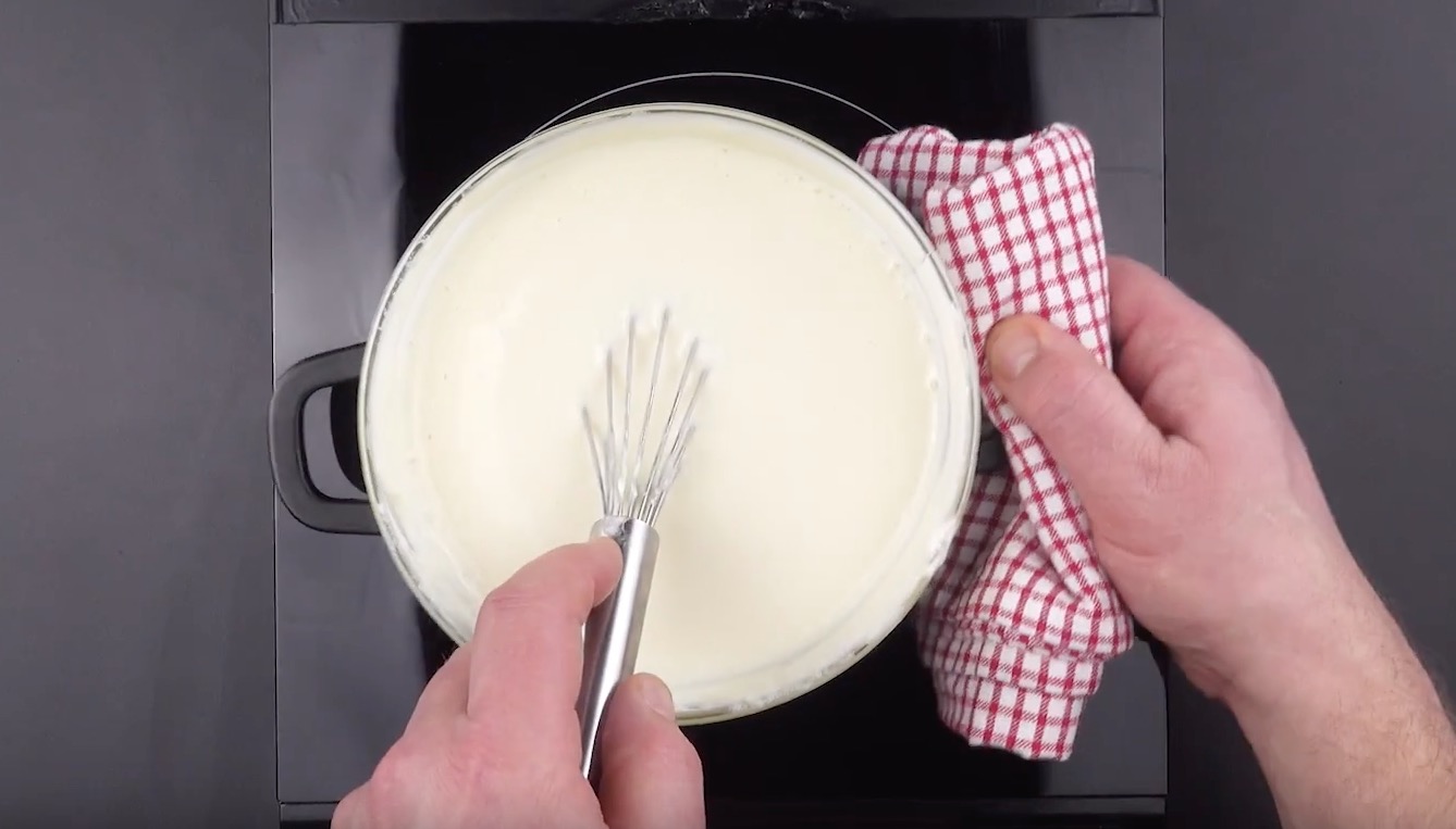 Schmilz anschließend die Marshmallows mit dem Frischkäse im Wasserbad. Verrühre während des Erhitzens beide Zutaten mit einem Schneebesen. Sobald sich eine einheitliche Creme gebildet hat, rührst du die Milch und den Zitronensaft unter.