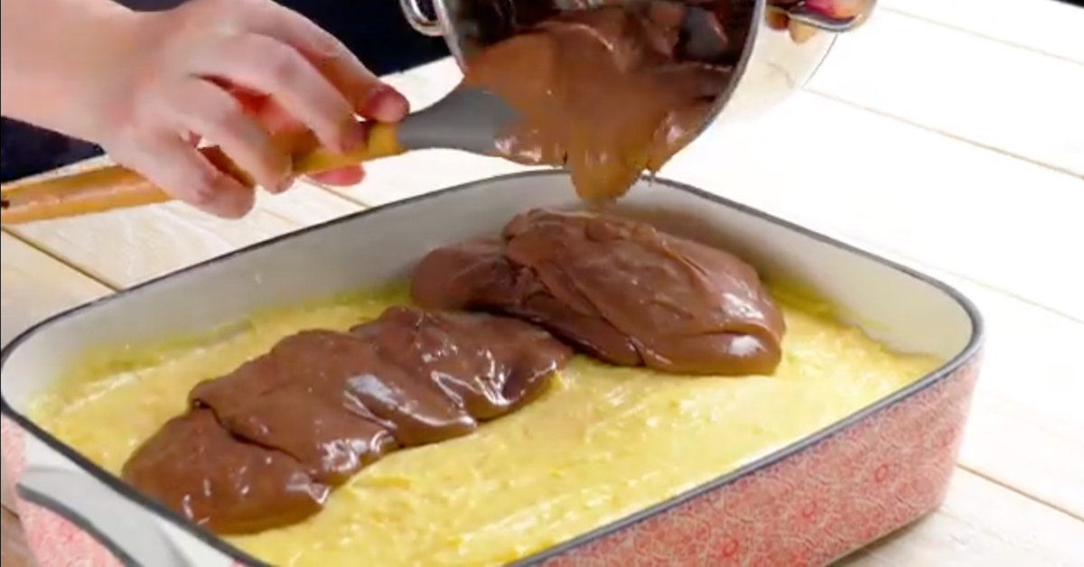5.) Als Nächstes kommt die schokoladige Schicht. Streiche den Schokopudding glatt auf den Vanillepudding.